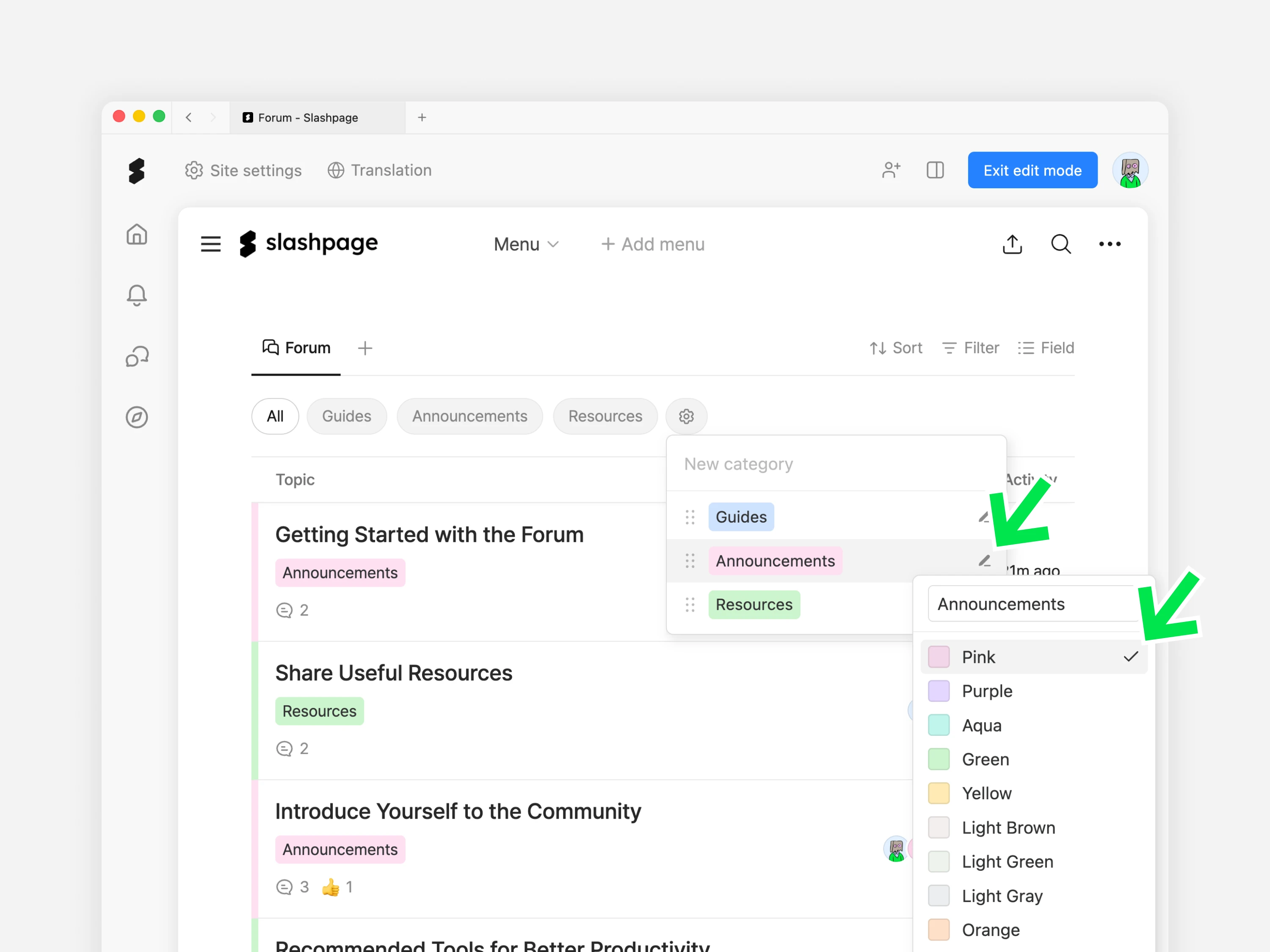카테고리가 설정된 글의 제목 왼쪽에는 카테고리 색상과 동일한 구분선이 표시됩니다. 이 색상을 변경하려면 글 목록 위쪽의 카테고리 설정 아이콘을 클릭합니다.