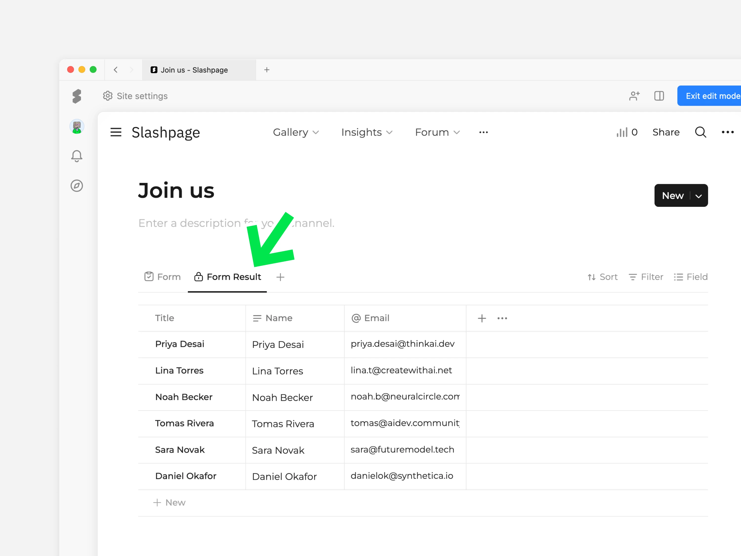 자동으로 추가되어있는 '설문 결과' 테이블 뷰를 클릭해 모든 응답을 설문 유형 별로 확인할 수 있습니다. 관리자 멤버 또는 사이트 소유자만 확인 가능합니다.