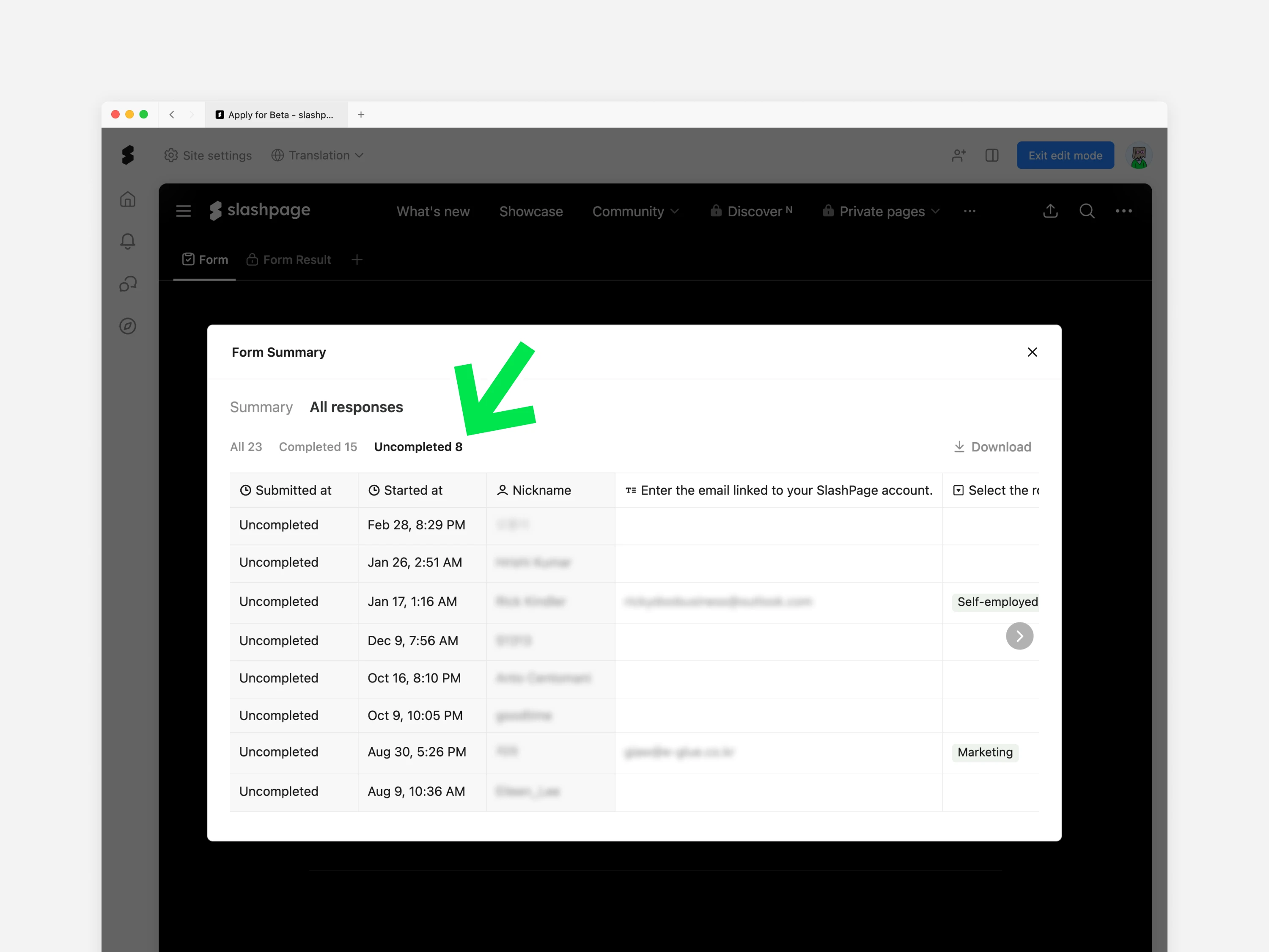 전체 응답: 제출된 응답과 미제출(작성중)된 응답