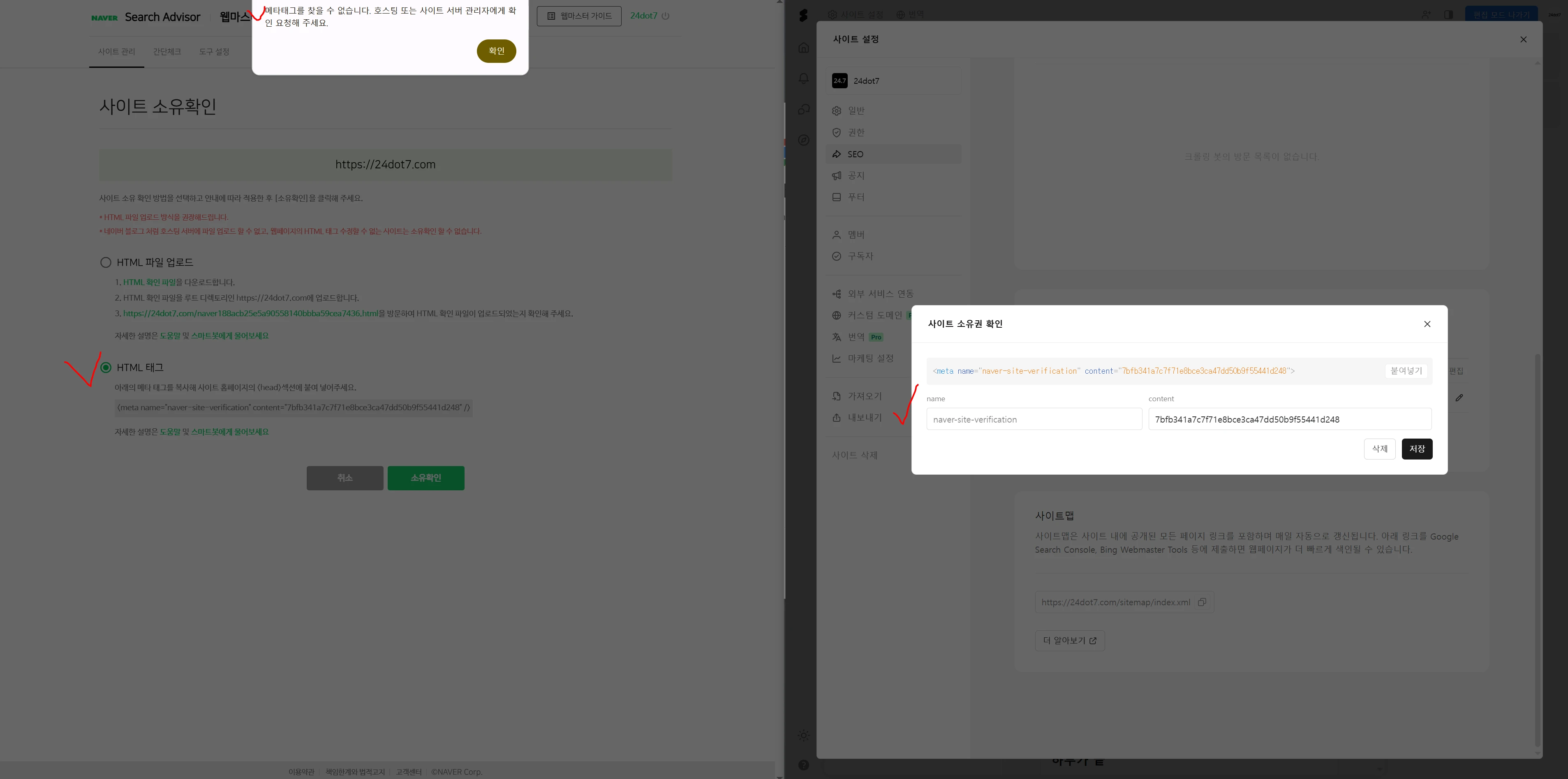 지금 적용했는데.. 메타태그를 찾을 수 없다는 얼렛이 나오고 있습니다. 이 부분은 어떻게 해결하면 될까요?
