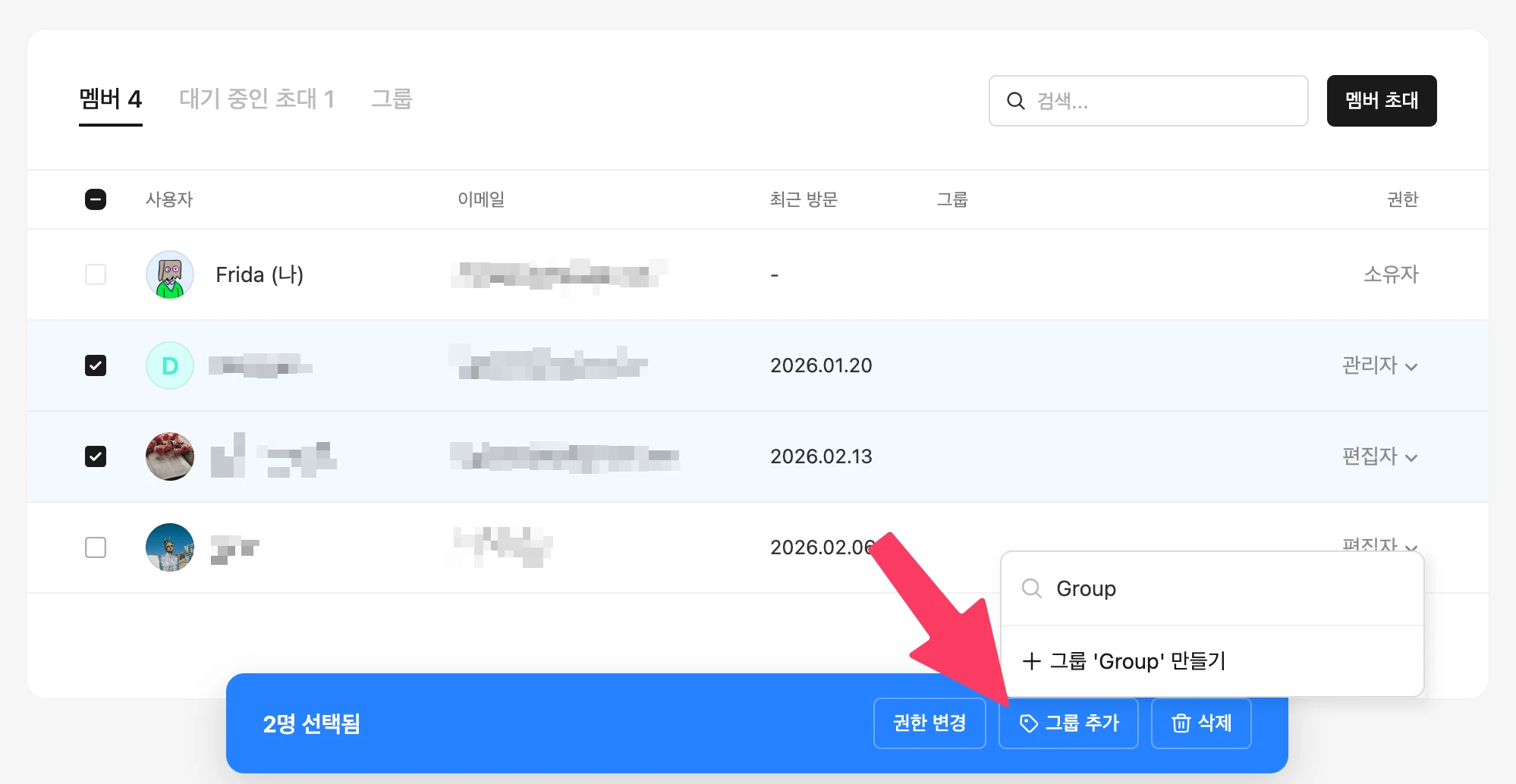 '사이트 설정 > 멤버' 메뉴의 멤버 목록에서 원하는 사람을 선택하여 그룹에 추가해 보세요. 그 다음 그룹을 필터링하여 멤버를 모두 선택하면 권한을 일괄 변경할 수도 있습니다.