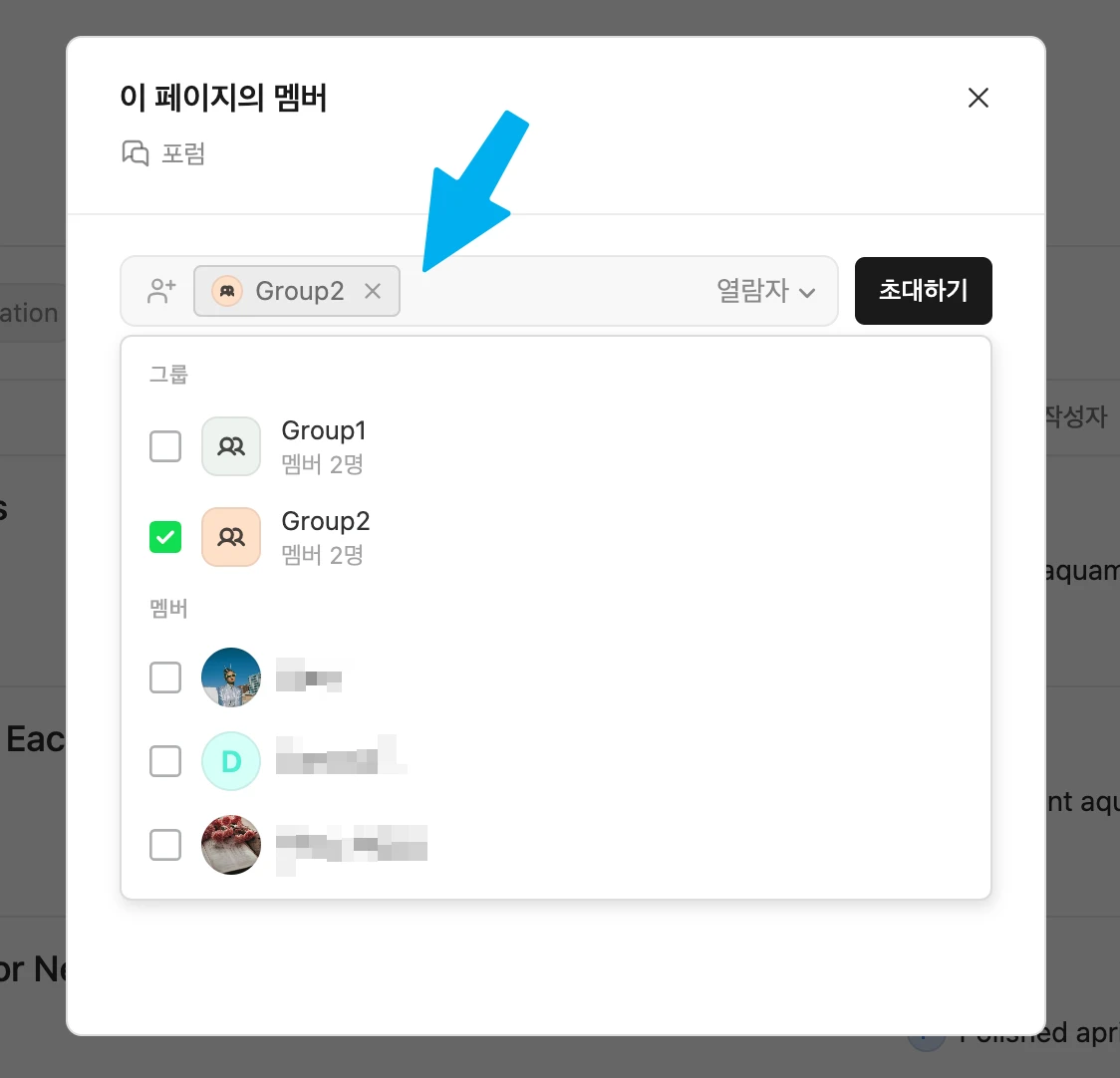 특정 비공개 페이지나 채널(게시판)에 들어가서 화면 오른쪽 메뉴 중 '멤버'를 클릭해 주세요. 먼저 해당 페이지의 멤버를 모두 삭제해 주시고, 검색창에 그룹 이름을 입력하고 원하는 그룹을 초대(추가)해 주시면 됩니다. (이때 그룹 권한도 설정할 수 있는데, 각 멤버들에게는 그룹의 권한과 개인의 권한 중 더 높은 것이 적용돼요.)