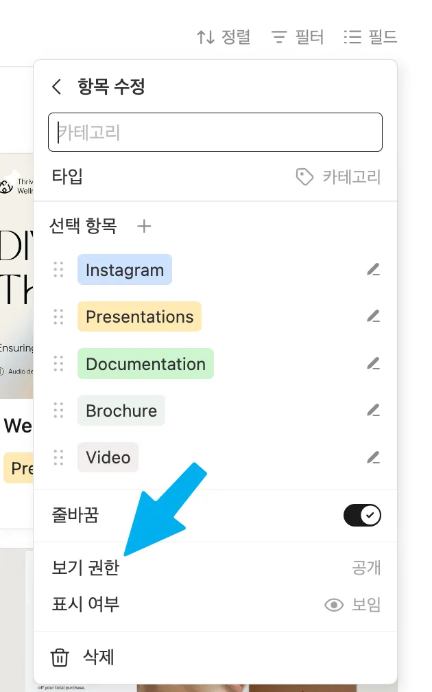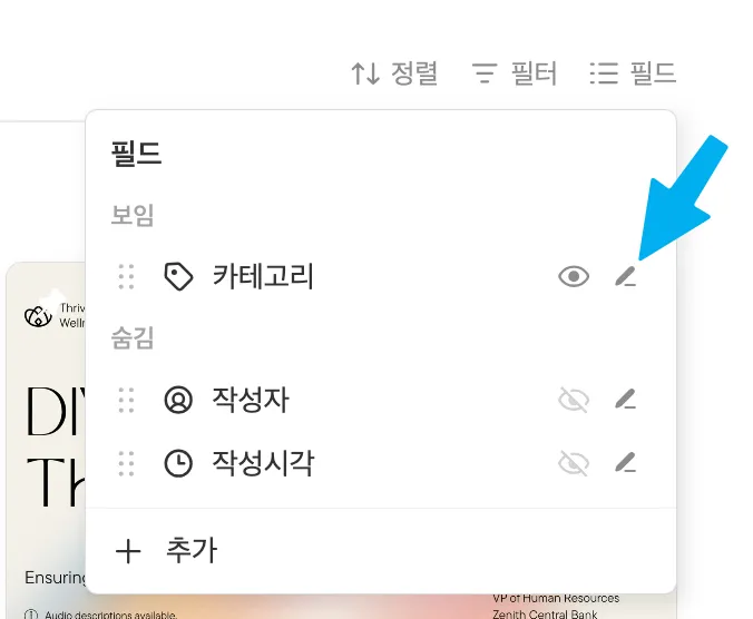 아래처럼 필드 설정에서 카테고리의 수정 버튼 클릭 후, 보기 권한을 공개로 바꿔보시겠어요?
