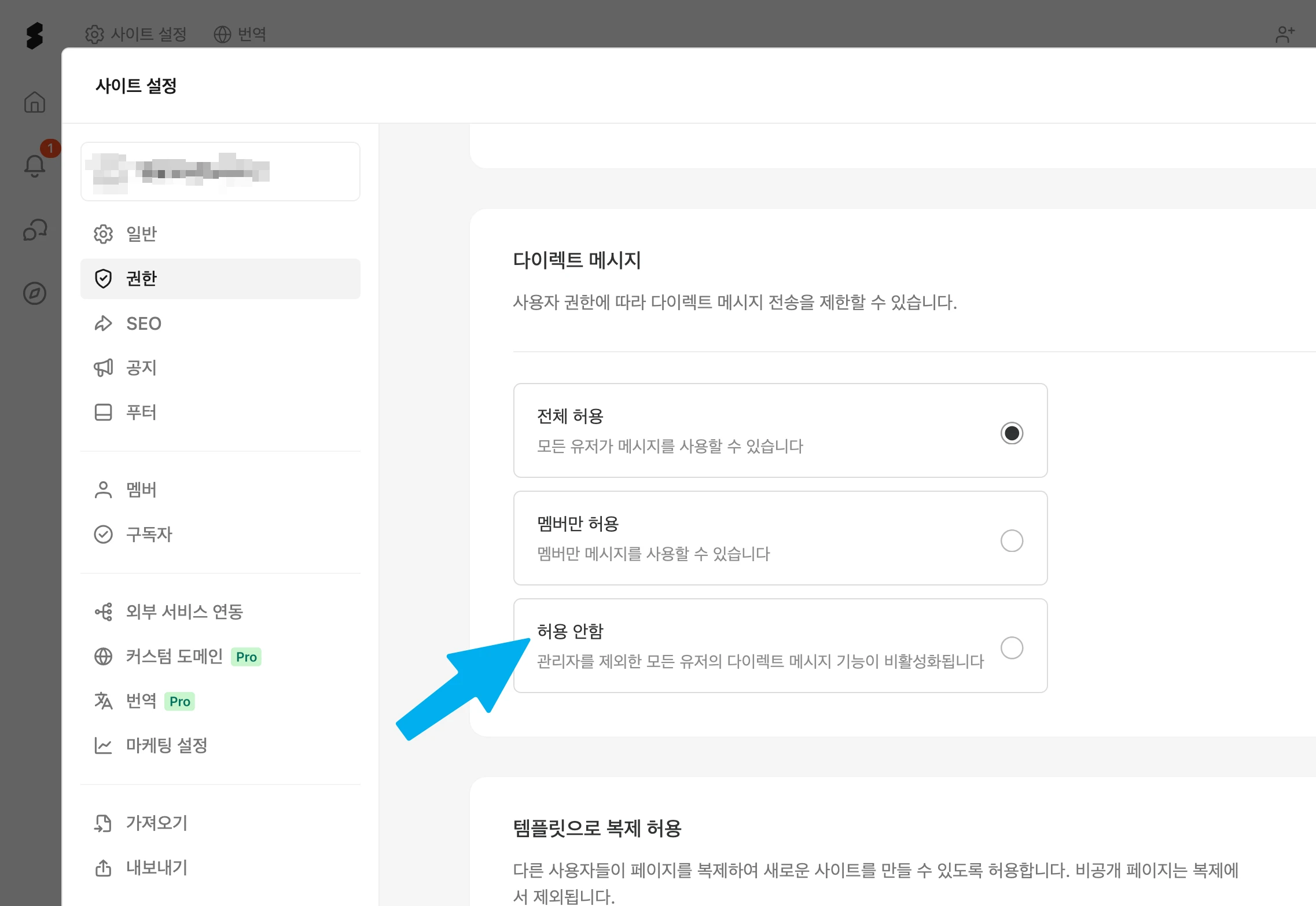 '사이트 설정 > 권한 > 다이렉트 메시지' 메뉴에서 '허용 안함'을 클릭해 주세요. 관리자와 소유자 외에는 사이트 내 다른 사람에게 메시지를 보낼 수 없게 돼요.