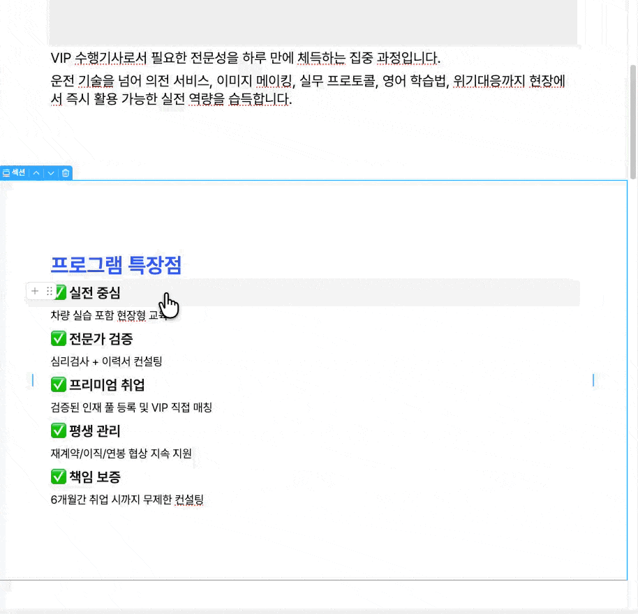 편집 기능 사용 시 취소와 저장 버튼이 있으면 좋겠습니다. 되돌리기 버튼이 없어서 테스트해보려고 디자인 등을 적용하면 이전으로 돌이킬수가 없다는 점이 갑갑합니다.