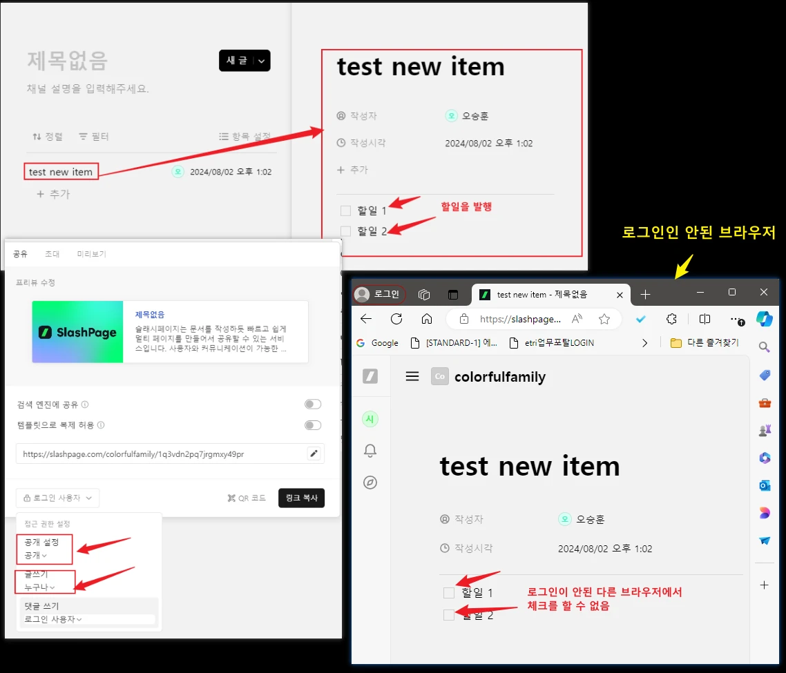 목록 채널에서 새글에 할일들을 발행해서, 로그인을 하지 않은 사람들도 업무를 체크하도록 쓰고 있었습니다. (첨부된 그림 참조)