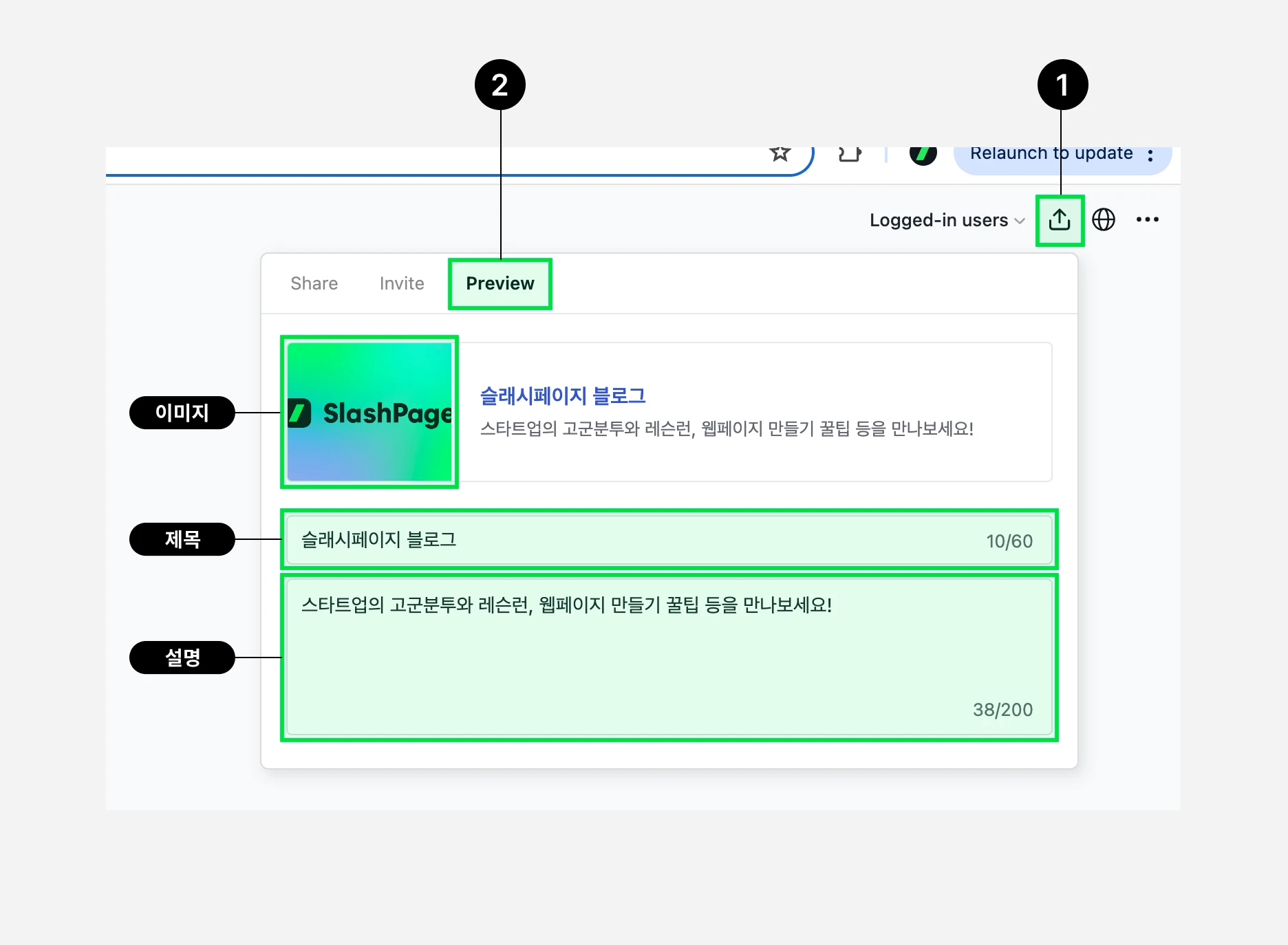 슬래시페이지 내에서 메타태그(미리보기)를 바꾸는 방법은 아래 이미지를 참고해 주세요.