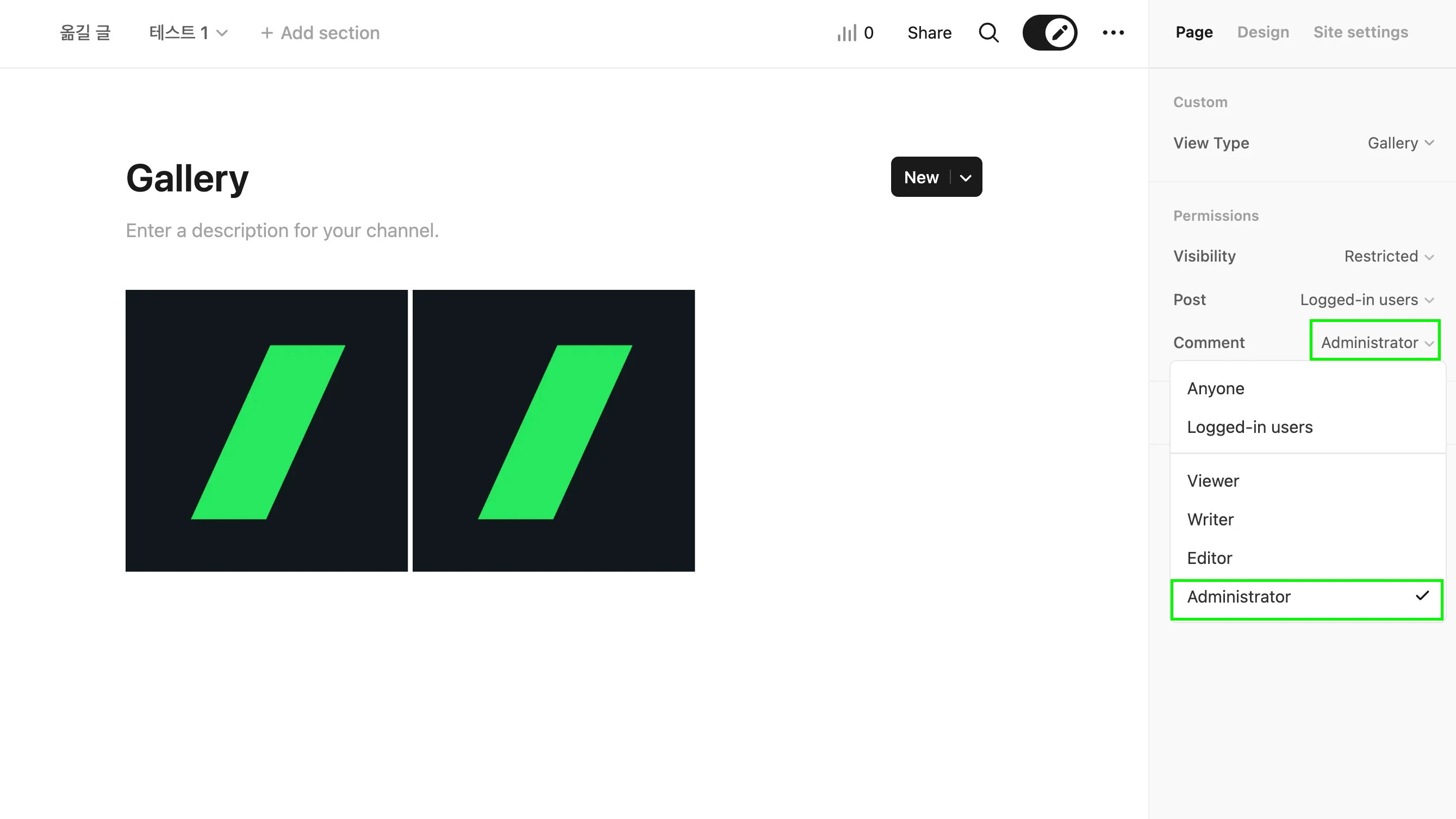 페이지 댓글 설정 버튼이 보이지 않음. 갤러리 채널