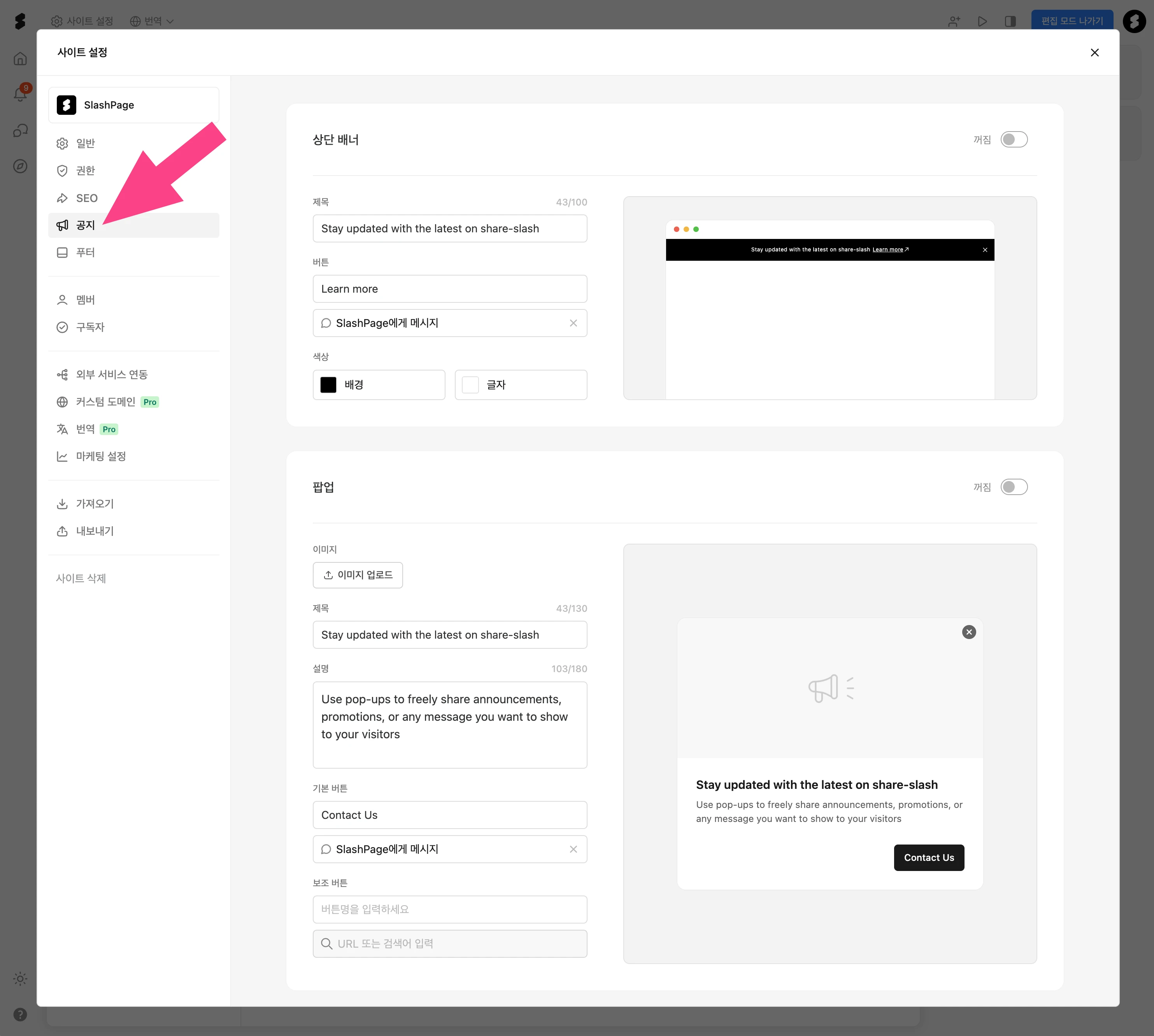 사이트 설정창의 '공지'메뉴에서 확인하실 수 있는데 한 번 사용해보시겠어요?
