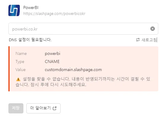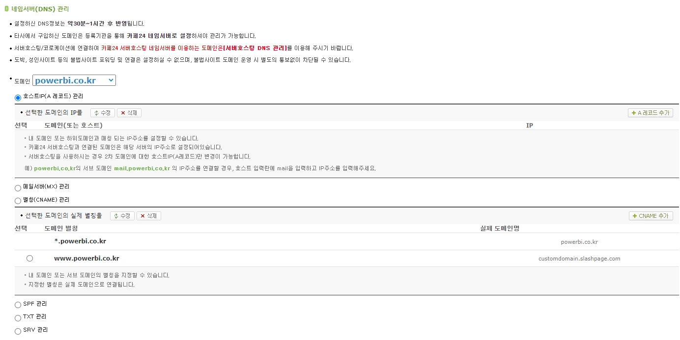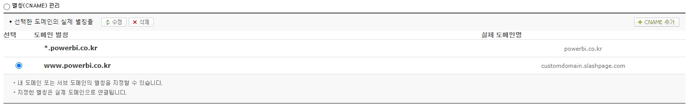 home.powerbi.co.kr 처럼 서브 도메인을 이용하시는 것도 좋은 방법입니다. 하신대로 CNAME 설정을 하시고 도메인 설정에는 home.powerbi.co.kr을 입력하시면 됩니다.