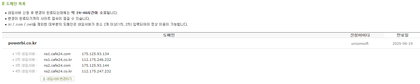 powerbi.co.kr 의 네임서버가 cafe24를 바라보게 설정돼있지 않습니다. 그것을 고쳐야 cafe24의 설정이 반영 됩니다. 도메인 구입처에서 네임서버 변경 방법을 문의해주시면 됩니다.