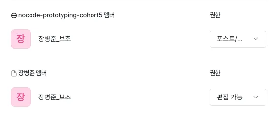 위 이미지 상에서 nocode-prototyping-cohort5가 상위 페이지고요. 그래서 포스트/댓글 권한은 전체로 부여된거고요. 각 멤버 상세 페이지 (하위 페이지) 마다 개별 멤버가 직접 자기 페이지를 수정할 수 있게 하고 싶거든요. 그래서 하위 페이지에서 다시 편집 가능 권한을 줬는데, "장병준_보조"가 하위 페이지인 "장병준 멤버"에 대해서 수정이 현재는 안됩니다.