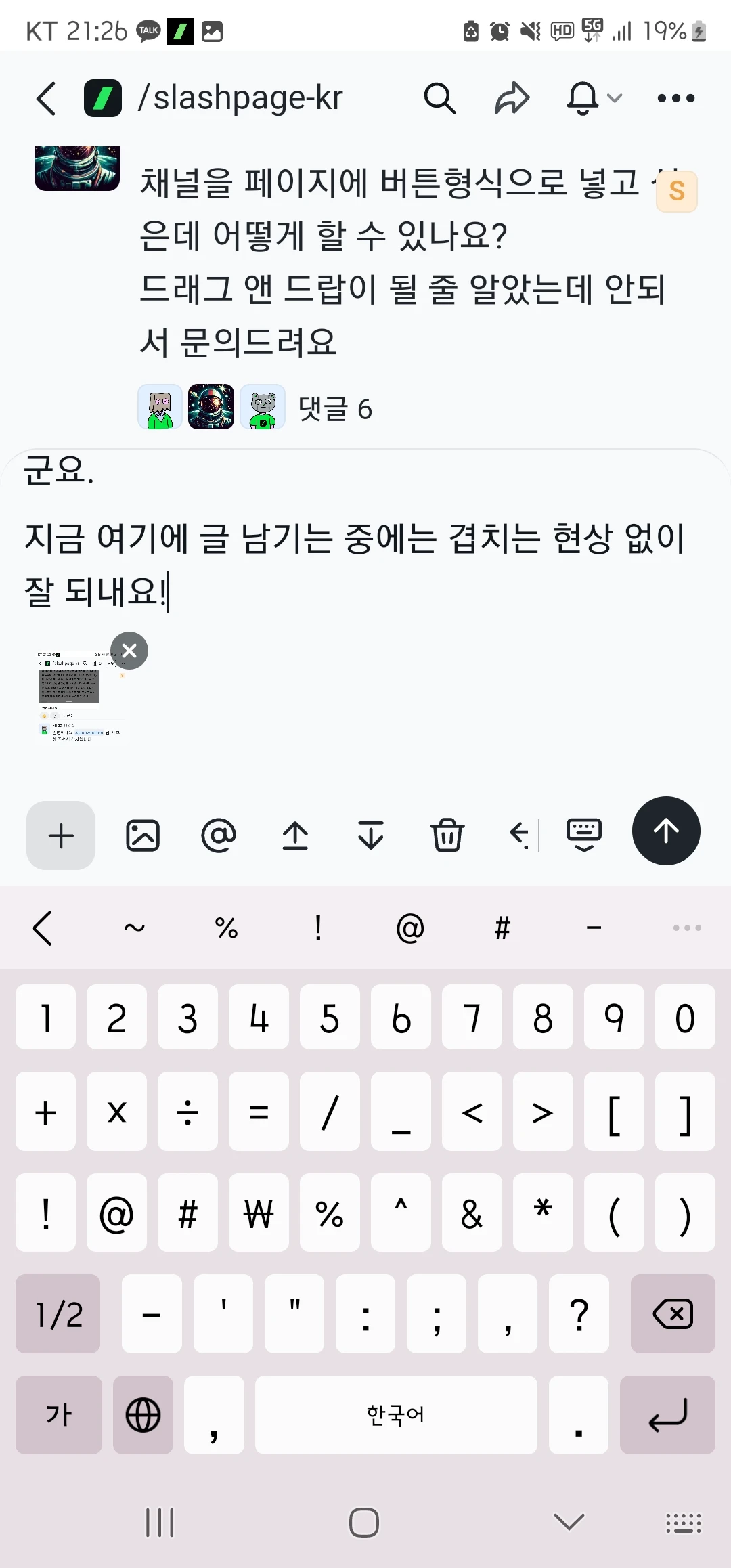 (오류 현상) 글 작성 영역이랑 하단 기능 메뉴 영역이 겹치는군요.
