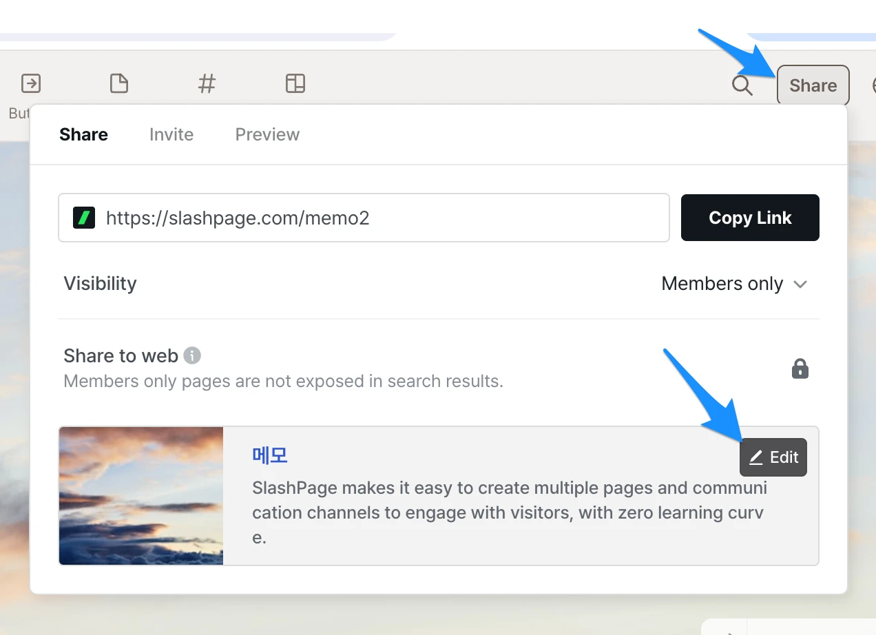 참고로 슬래시페이지의 링크가 어떻게 보일지 미리 보고, 수정까지 할 수 있는 기능의 위치도 안내해드려요. :)
