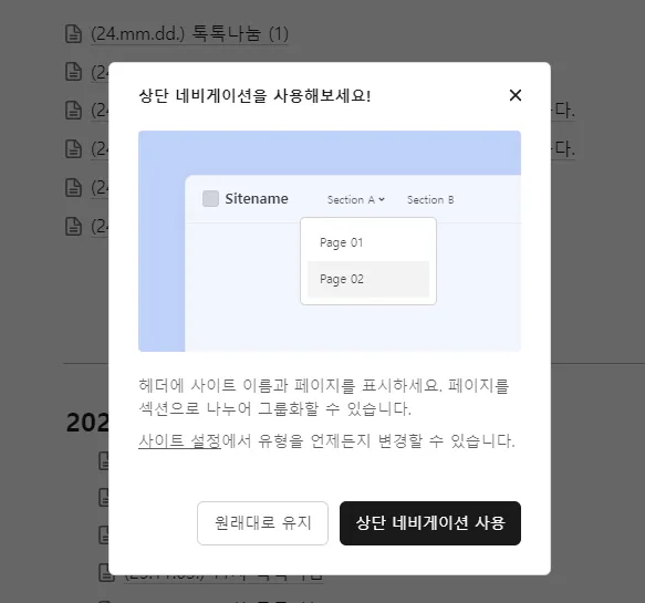 아래와 같이 상단 네비게이션 사용해보라고 해서 설정했는데.. 그 동안 구성했던 블로그 채널들이 없어졌습니다.