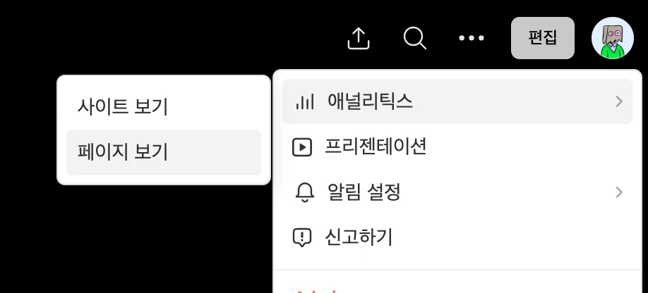 화면 오른쪽 위 ... > 애널리틱스 > 페이지 보기 를 클릭해 주세요.