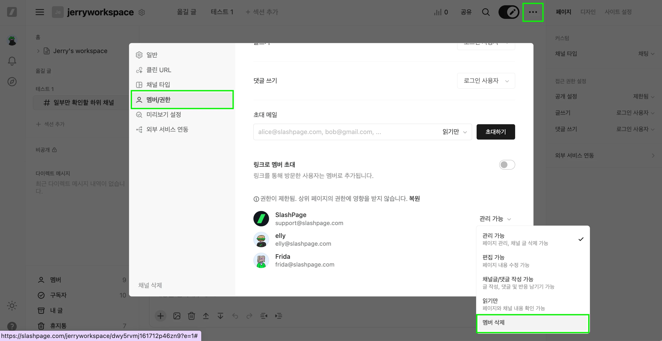이제 상위 페이지의 멤버/권한에 영향을 받지 않는, 일부 인원만 포함된 하위 채널로 사용하실 수 있어요. 만약 새로운 인원을 해당 하위 채널에 초대하고 싶다면, 사이트에 초대하는 것과 같은 방식으로 초대해주시면 돼요.