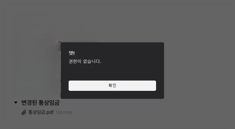 안녕하세요 파일 권한 관련해 문의 드립니다. 아래 사진처럼 PDF 업로드해서 공유하려 하는데, 다른 사용자에게 '앗! 권한이 없습니다.' 메시지가 뜨고 있습니다. PDF 뷰어와 다운로드 차단 여부도 확인했는데 작동이 잘 안되네요
