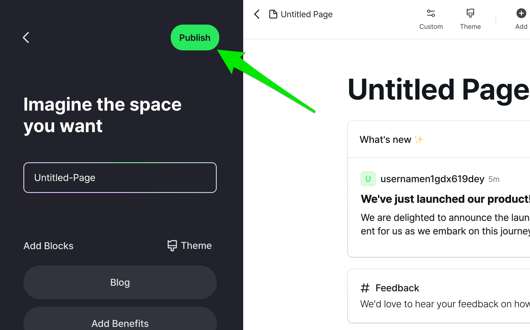 플레이그라운드에서 만든 사이트는 임시 페이지입니다. 제작자 계정(주인/마스터) 정보가 없기 때문에 공개여부 설정을 할 수 없는데요, 좌측 상단의 [Publish]버튼을 선택하면 계정이 연동되면서 공개여부를 설정할 수 있게 됩니다.(이미지를 첨부합니다)