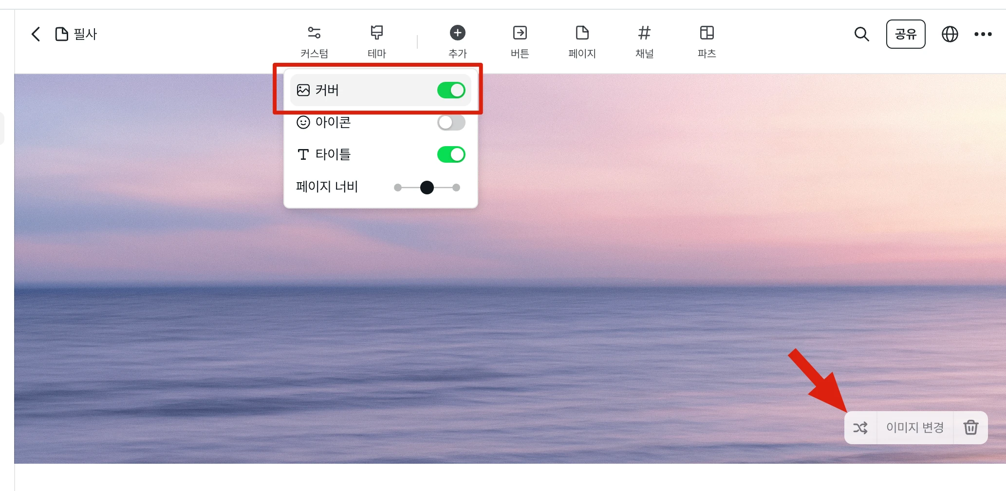 페이지 댓글 설정 버튼이 보이지 않음. 갤러리 채널
