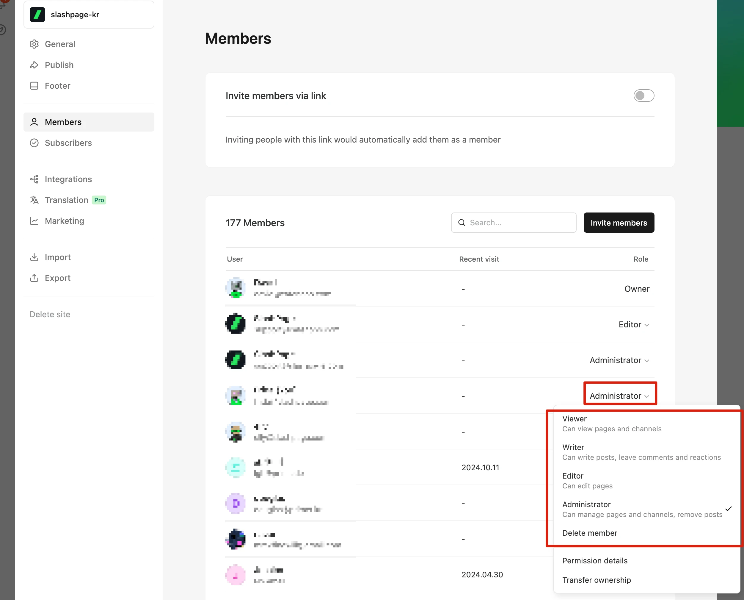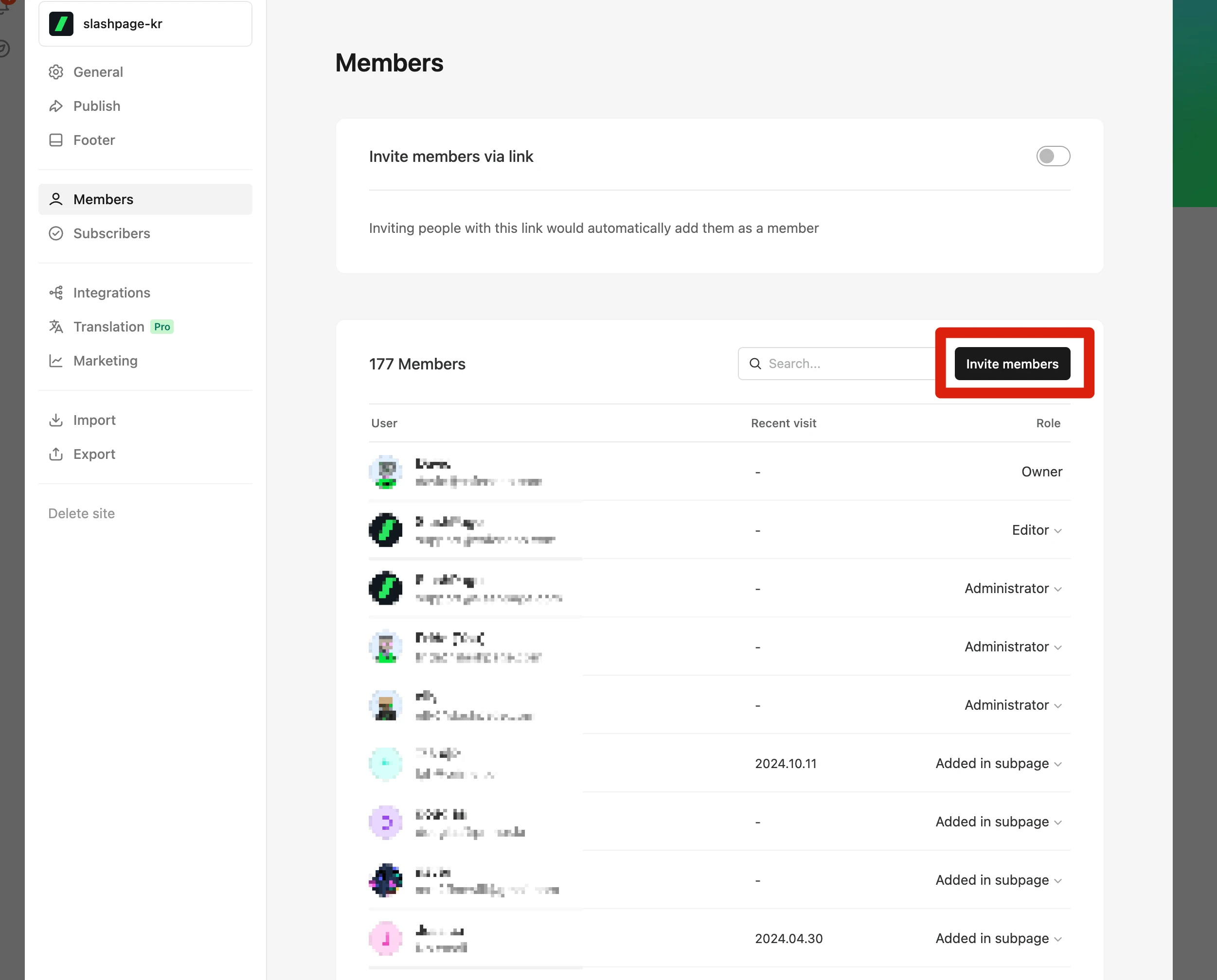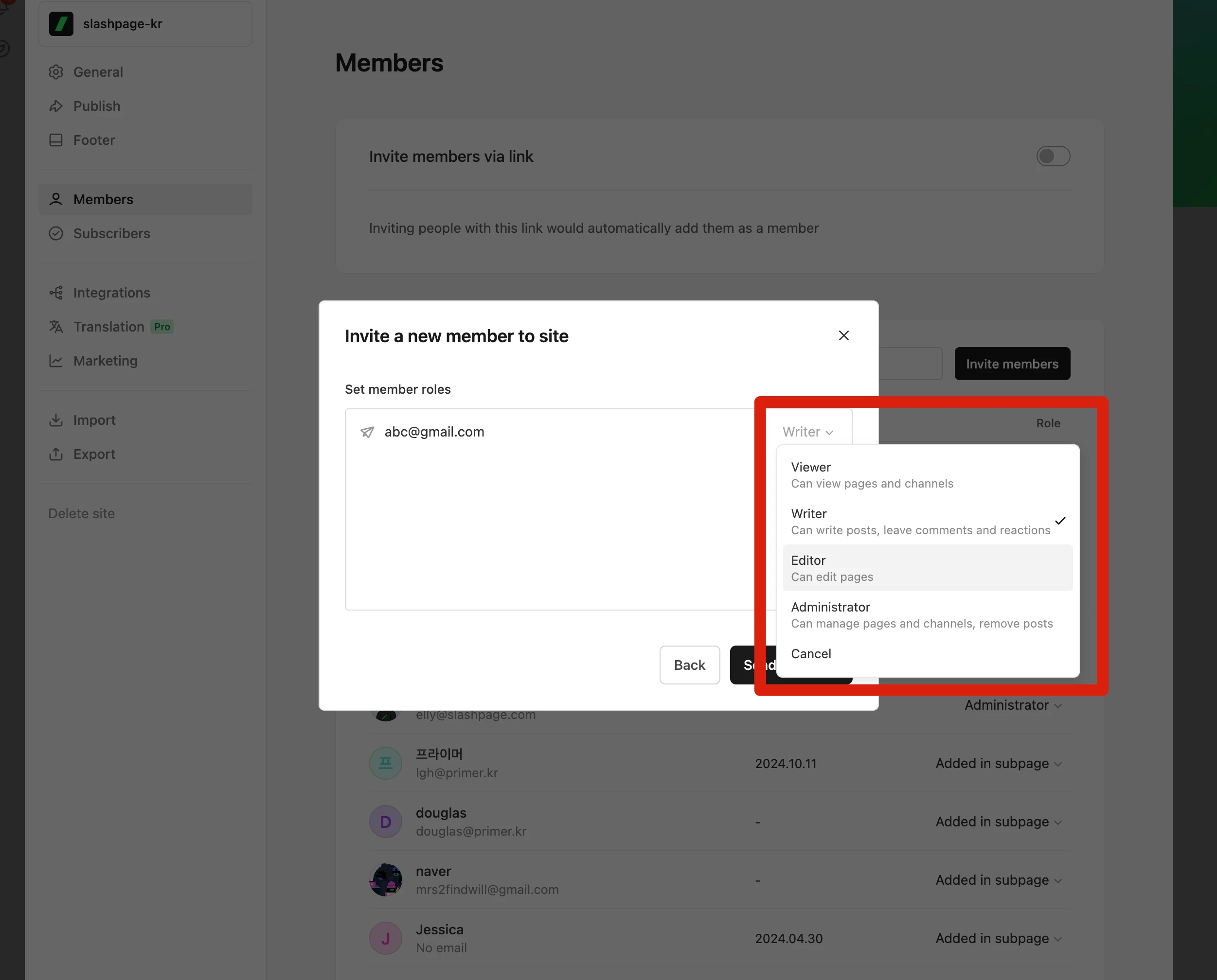 수정하고자 하는 사이트에 이미 초대가 되어있다면, 관리자 또는 소유자에게 멤버 목록에서 권한을 Editor(편집자) 이상으로 변경해 달라고 요청하시면 됩니다!