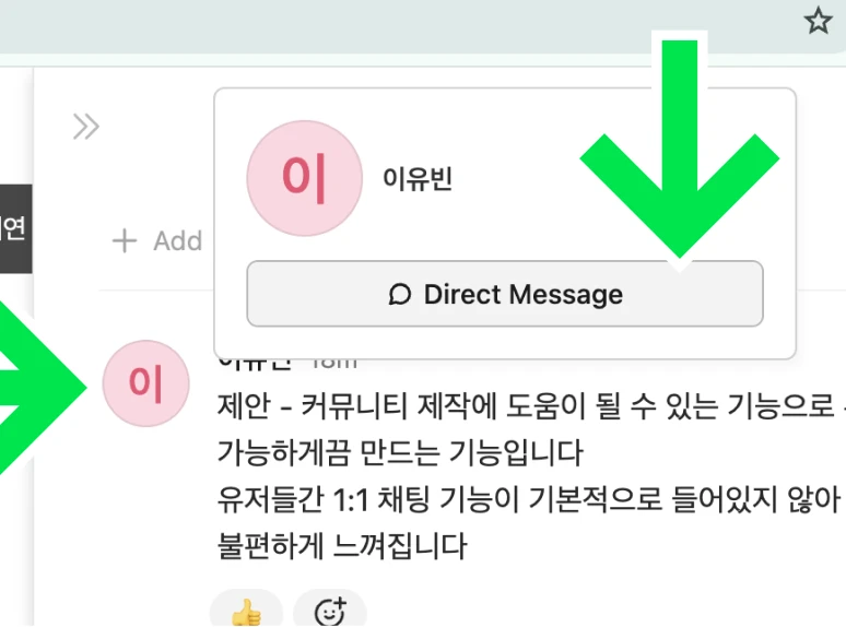 제안 - 커뮤니티 제작에 도움이 될 수 있는 기능으로 유저들간 1:1 채팅이 가능하게끔 만드는 기능입니다
