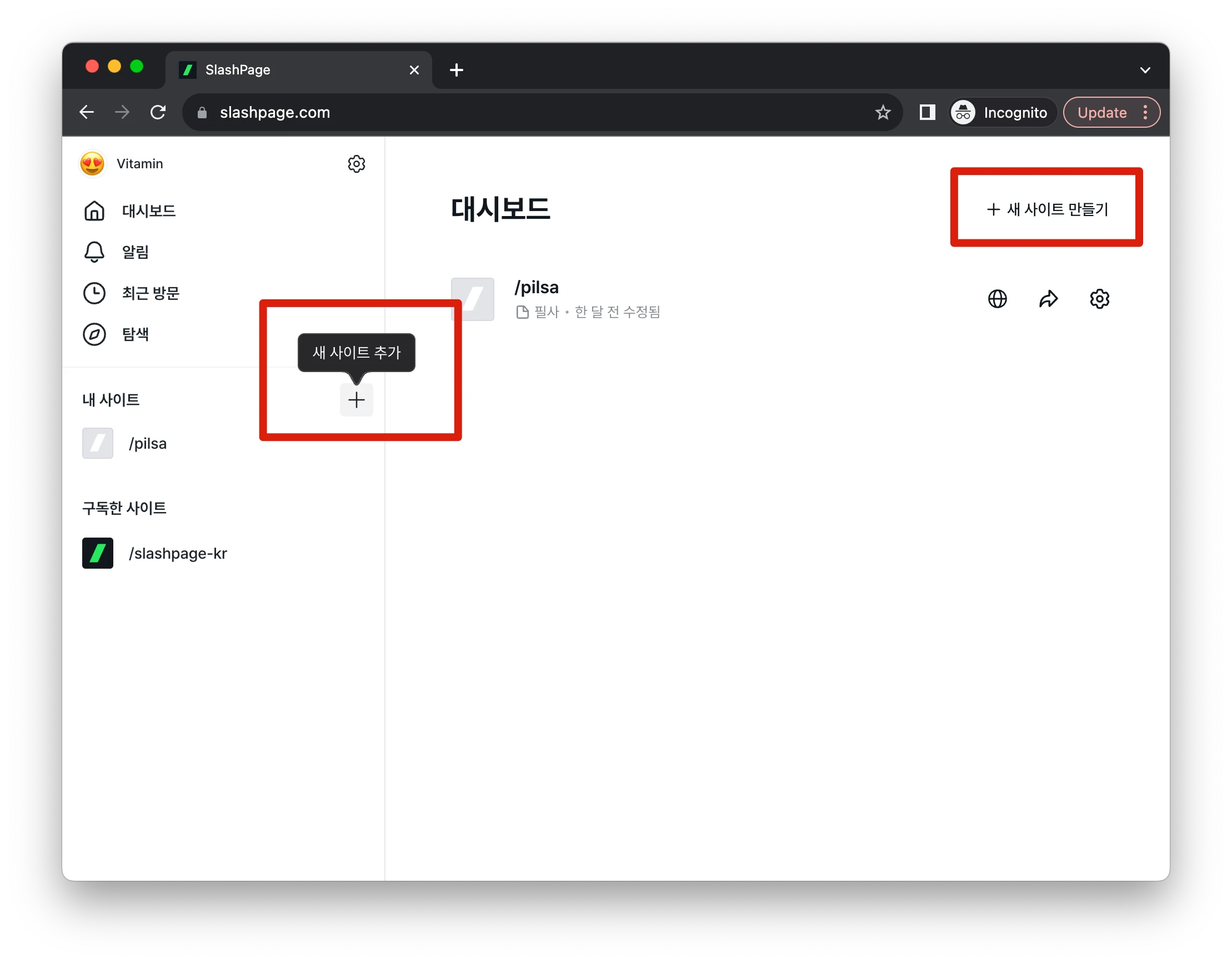 슬래시페이지 홈으로 가셔서 새 사이트 만들기 버튼을 누르면 됩니다!