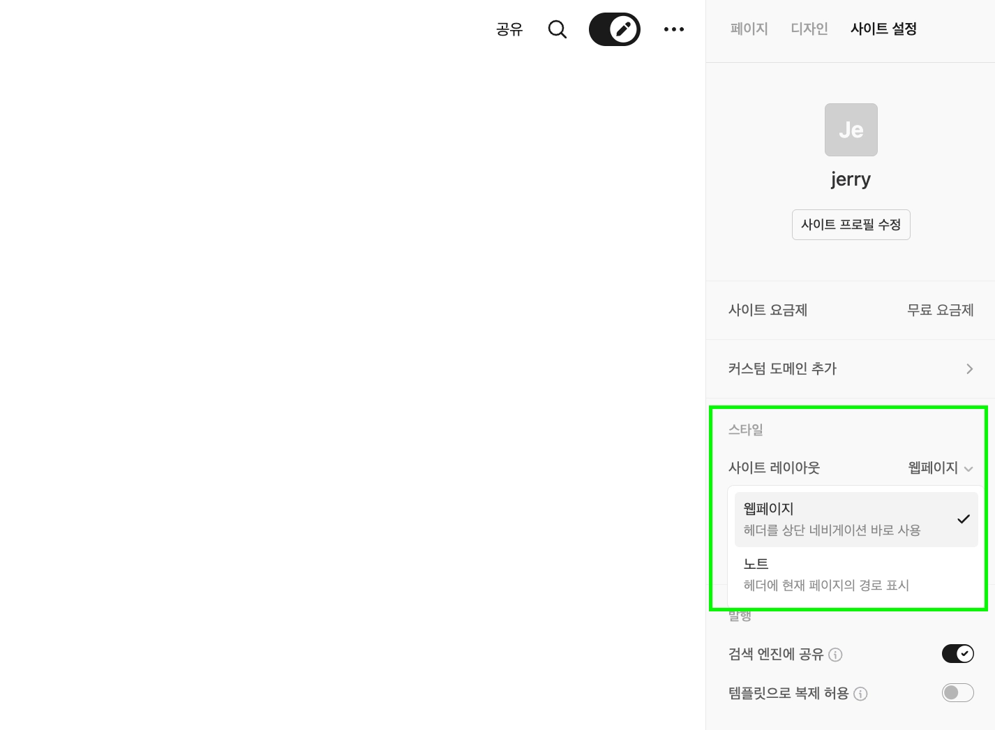 사이트 편집모드에서 우측 설정 패널 > 사이트 설정 > 사이트 레이아웃을 노트에서 웹페이지로 바꿔보시겠어요?