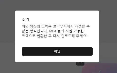 해당 오류는 .avi 형식의 비디오 재생을 브라우저에서 지원하지 않기 때문에 생기는 문제인데요. .mp4 등의 형식으로 변환하신 후에 시도하시면 정상적으로 업로드하실 수 있을 거예요!