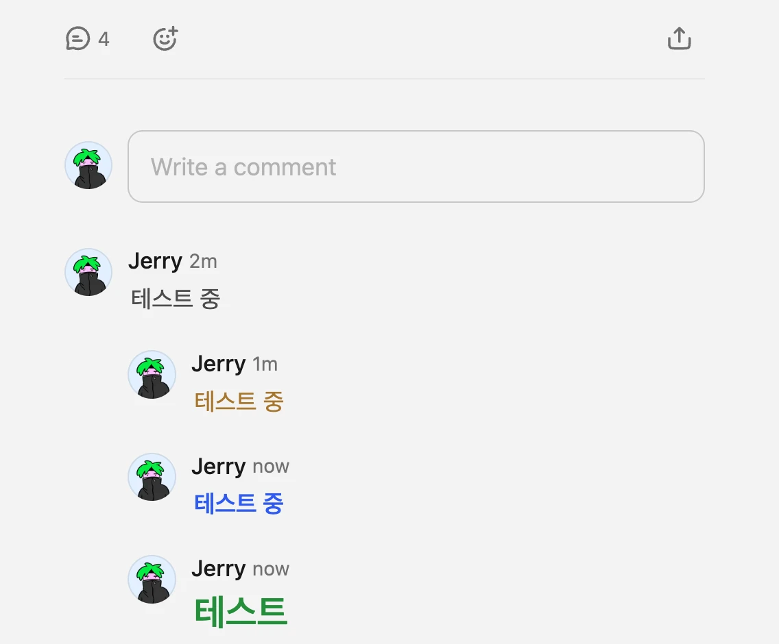 일반 페이지에서 댓글에 댓글을 달고 입력한 텍스트를 선택한 뒤 bold나 color 등 양식을 적용하면 저장해도 적용되지 않는 버그가 있네요. (여긴 잘 되네요)