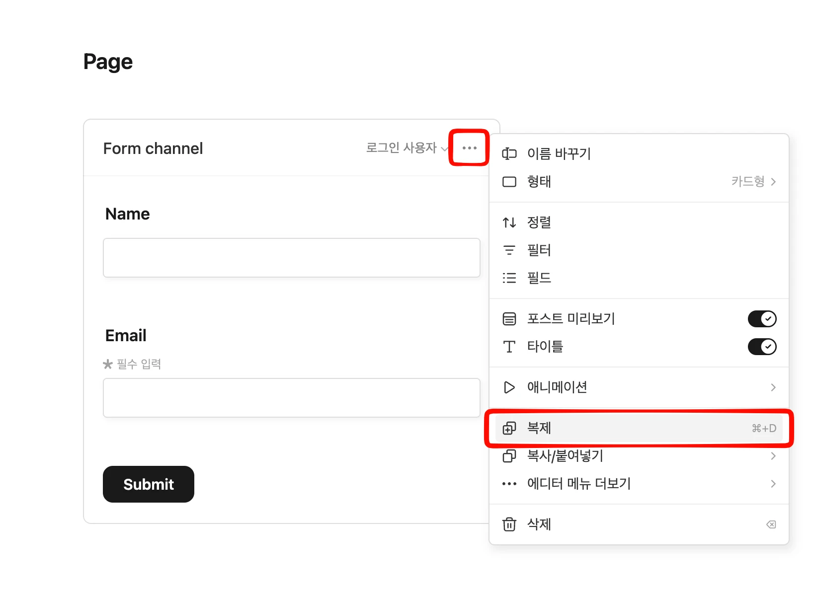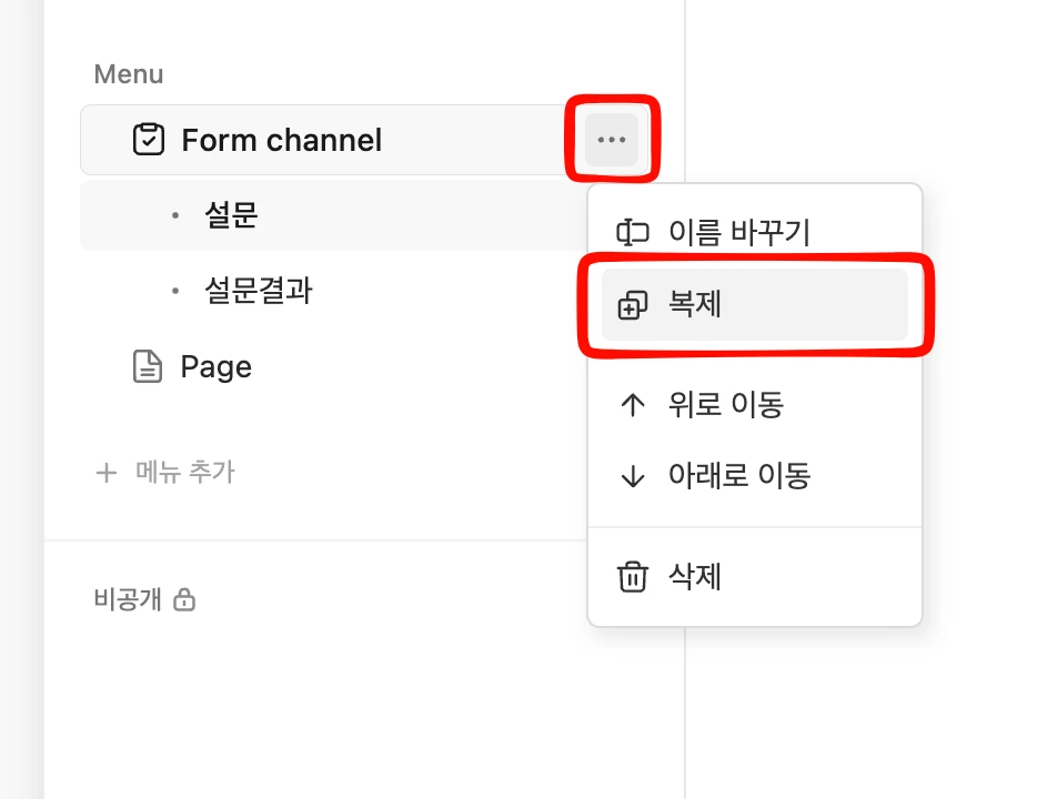 님! 아래 두 가지 방법으로 설문 채널을 복제할 수 있으며, 질문들과 설문 완료 페이지가 함께 복제됩니다. (응답은 복제되지 않습니다.) 이렇게 한 번 사용해 보시겠어요?