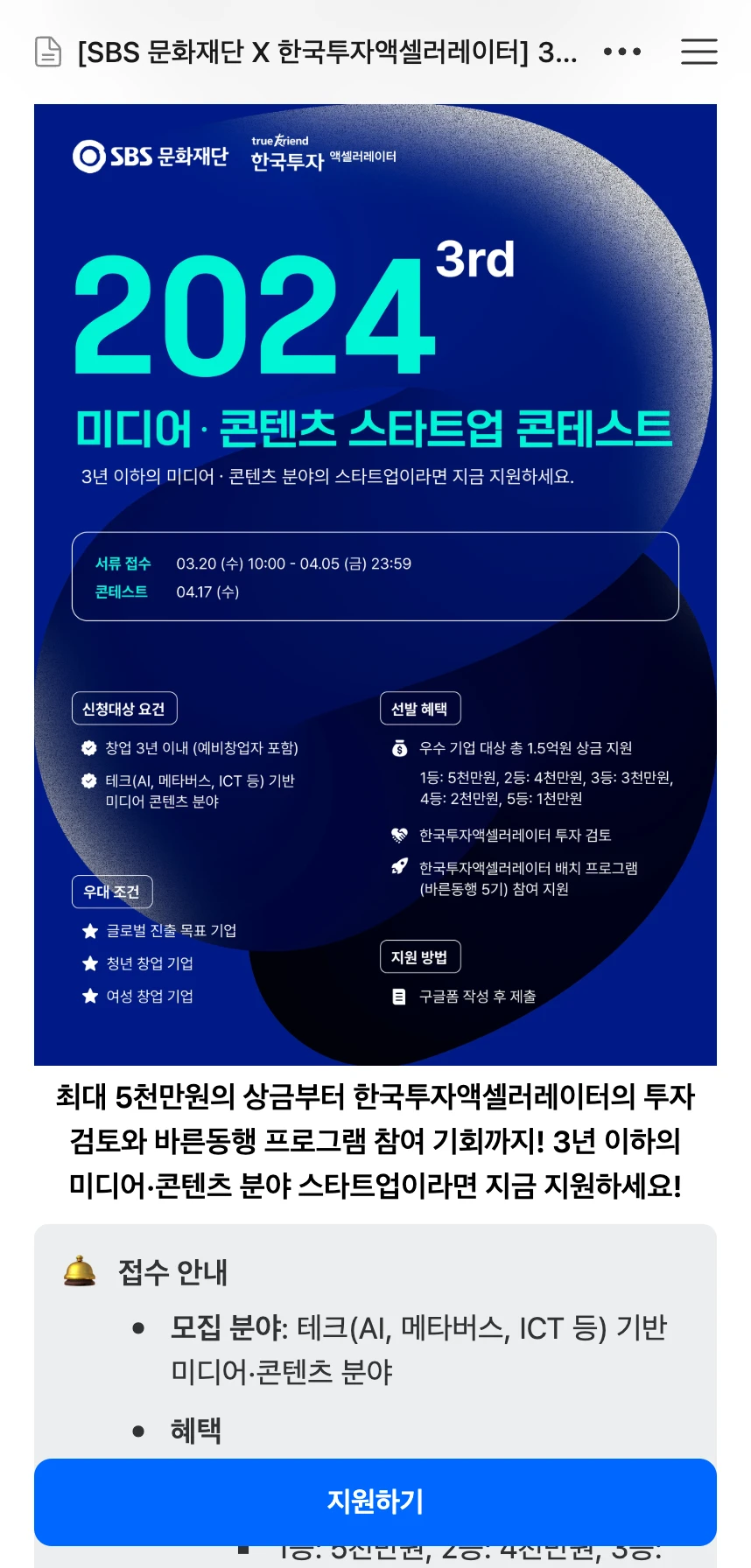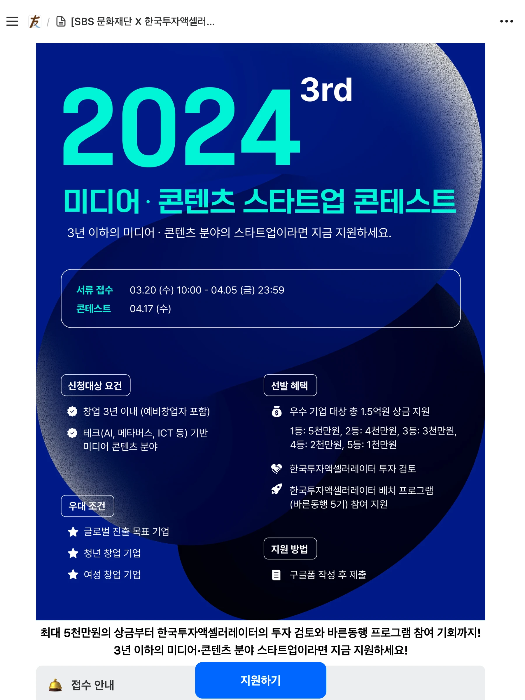 SBS 문화재단 X 한국투자 스타트업 콘테스트