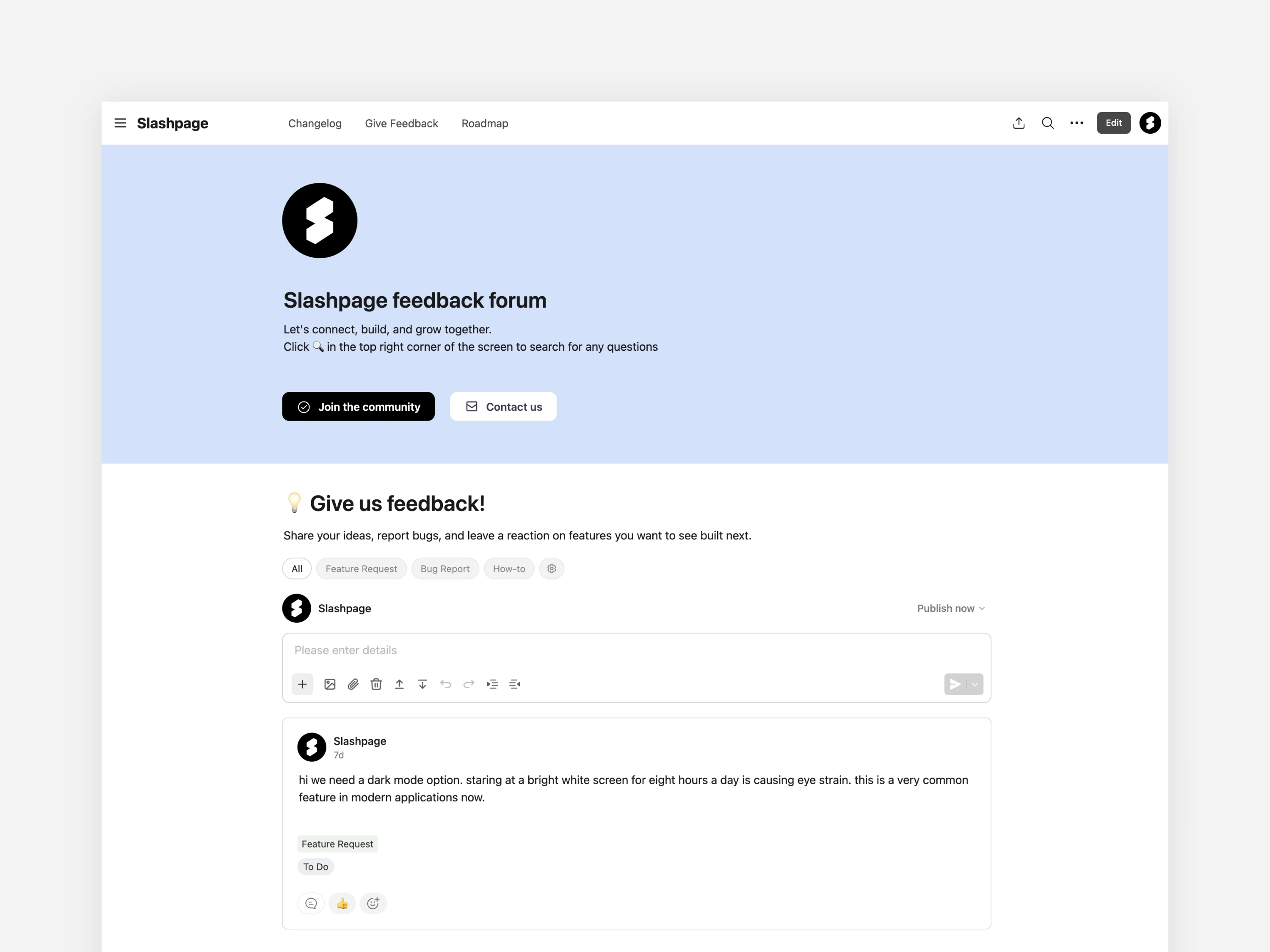 Below is a practical playbook for early-stage startups on how to transform scattered user feedback into actionable insights that directly improve your product. Key Takeaway Small teams must organize user feedback to allocate limited development resources effectively, retain early users, and increase overall customer satisfaction. To manage user feedback efficiently with minimal time and staffing, follow this workflow repeatedly: centralize feedback, categorize it with clear tags, prioritize items, notify users to close the feedback loop after improvements, and check user reactions. Why Organizing Feedback Is Critical for Early-Stage Startups Allocate limited development resources more efficiently If your team sets priorities based only on internal assumptions, you may focus on features users do not need. For example, imagine a small design tool adding an advanced drawing pen feature that most users never request. To avoid wasting time, budget and development resources on low-impact features, we recommend categorizing user feedback and assigning priority levels instead of relying on team intuition. Retain early users by building features they actually want If your product is still incomplete, early adopters are more valuable. Collect feedback actively and implement the features you can deliver quickly with minimal resources. When users see that their feedback is reflected in the product, they are more likely to stay engaged and become long-term supporters. Improve overall user satisfaction long-term Some feedback can be addressed immediately, while other requests may only be resolved months later. If feedback is stored with categories and statuses, you can notify users easily when improvements are made. In our experience, notifying users about improvements significantly increases loyalty and engagement. Even if they've churned, that notification may bring them back. This is only possible when user feedback is organized systematically. 6 Steps to Organize User Feedback Efficiently With Minimal Resources This workflow guides small teams on collecting feedback from multiple sources, categorizing it, prioritizing, implementing improvements, notifying users, and repeating the process. 1. Centralize all feedback in one place Collect all user feedback from every channel (email, surveys, etc.) into a single hub. Record each piece of feedback together with the user's ID or email so you can quickly notify them once the issue is resolved. Set everything to a Backlog state first for proper organization. Whenever new feedback comes in, simply repeat this setup. If you want a tool that automatically gathers feedback from multiple sources, Canny is a solid option. However, its free plan tracks feedback from only up to 25 users. Considering future growth, it can be a better long-term choice to centralize all feedback into a single feedback board using Slashpage, which offers unlimited users and unlimited feedback. Action Checklist Create a workspace using Canny, Slashpage, or similar feedback management tools.