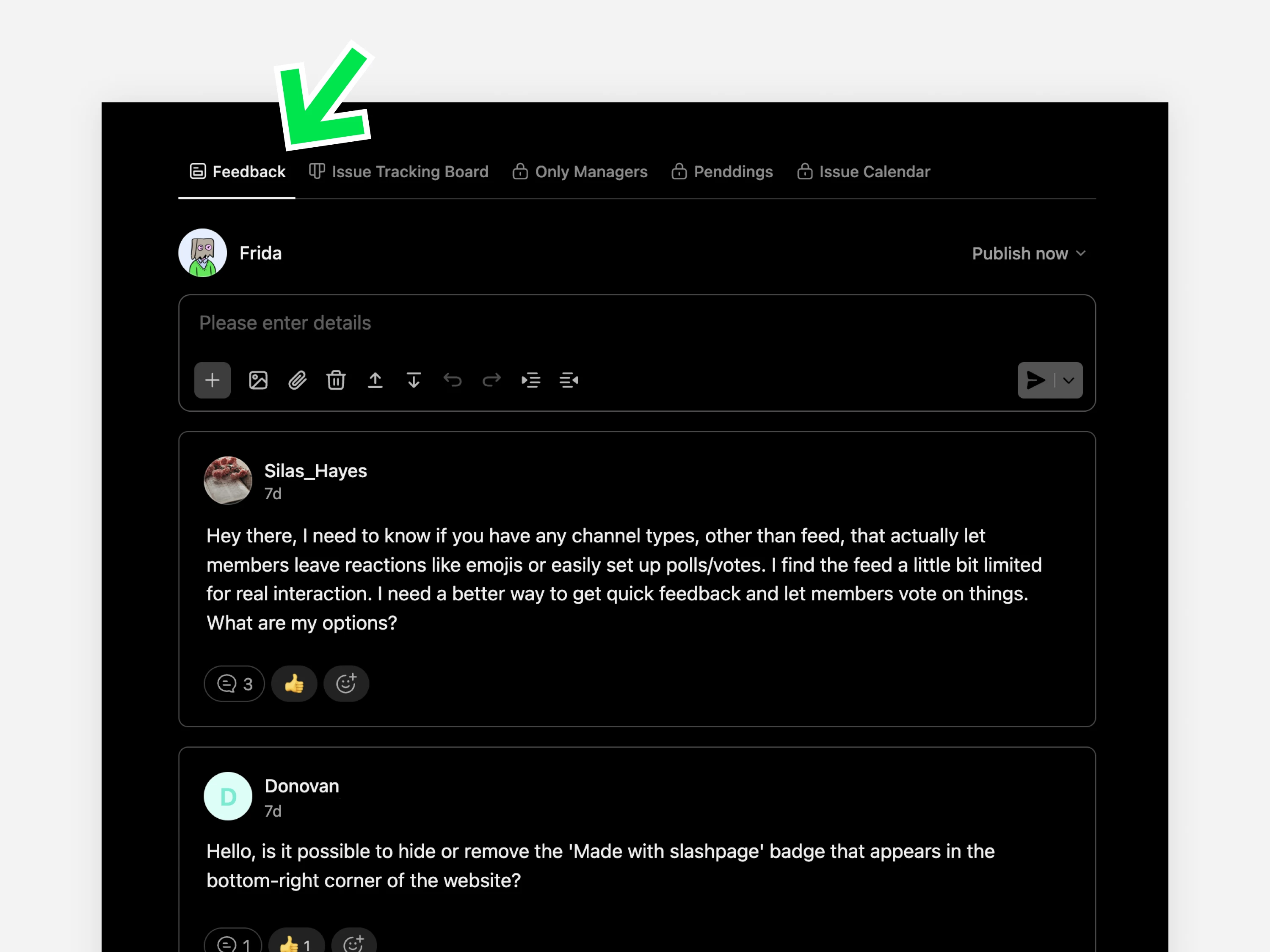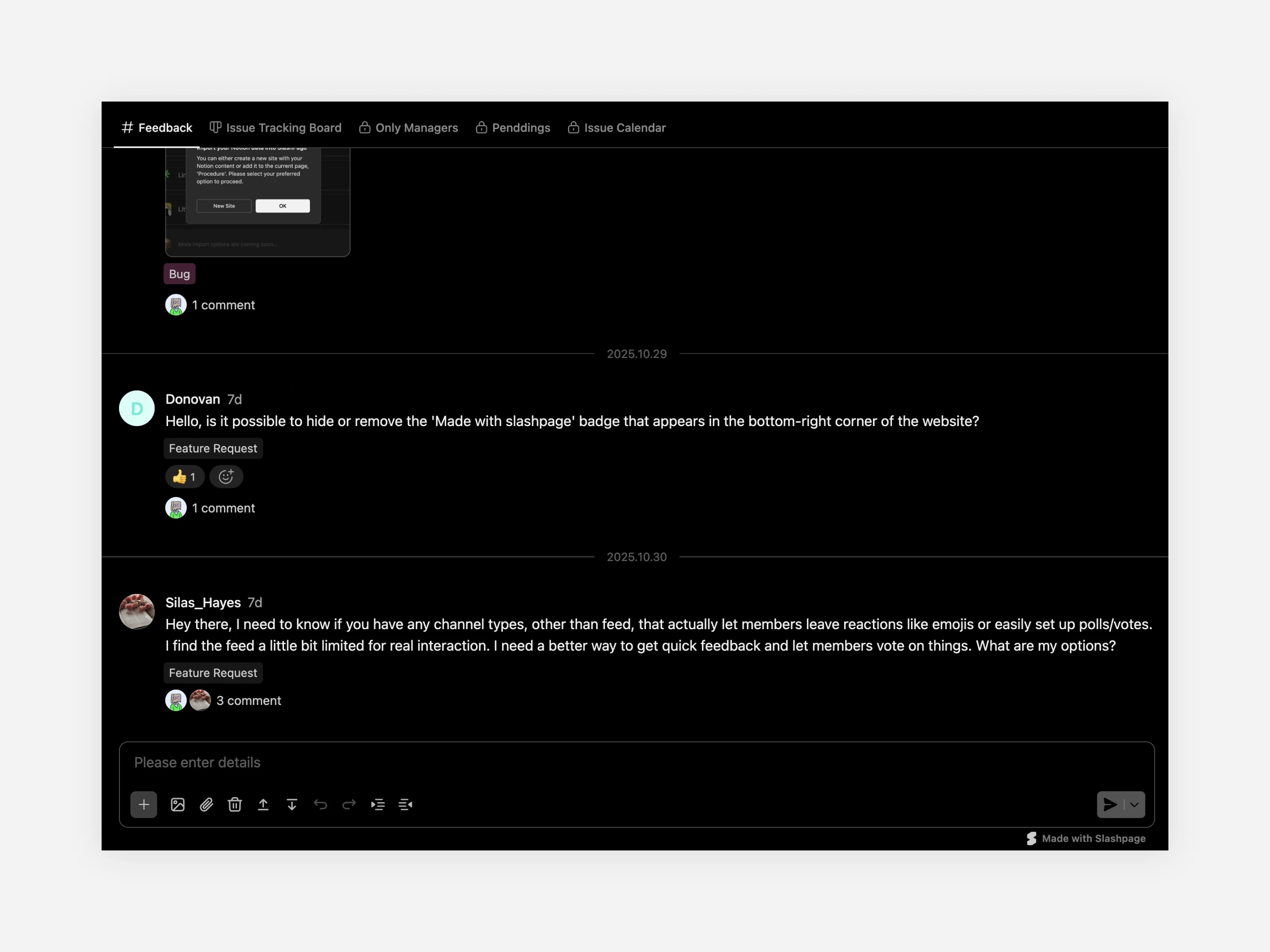 Public feedback board | Builds transparency, users can see and search submissions | Slashpage, Rapidr, Canny, Featurebase |