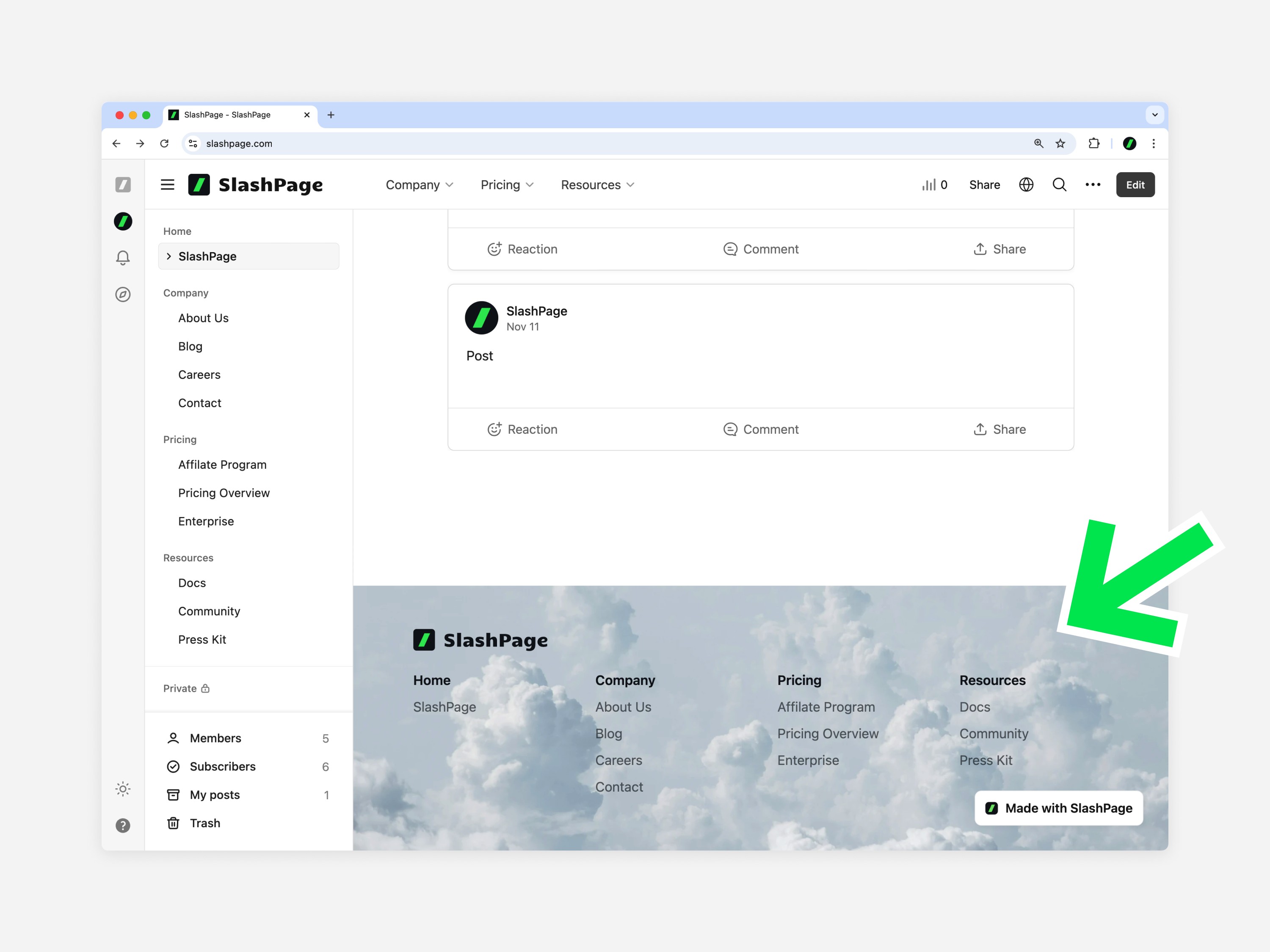 Footer (Beta Feature) - Slashpage Help CenterThis is an area at the bottom of the screen where links are collected so that you can easily move to other pages or external links within the site, such as brand introduction, blog, recruitment, and social media. The footer is a feature currently being tested by beta testers. If you would like to use it, please apply by clicking ? > Help at the bottom left of the screen. Add footer Click Add Footer at the bottom of the editing screen . In the Settings window, click Create . Use the footer editing tools to place your logo, sitemap, text, and anything else you want. (The footer will not be visible in view mode until you enable it.) Footer editing tools Site Logo Add a favicon and text logo as a block on the top left of your site. (If you are using an image logo instead of text, you will only see the image logo without the favicon.) Clicking on this block in view mode will take you to the home screen. Sitemap Loads all the site's menus and sub-channels and pages for each menu. The number of columns can be adjusted from 1 to 5, and after loading, you can add, edit, delete, and rearrange text and links.