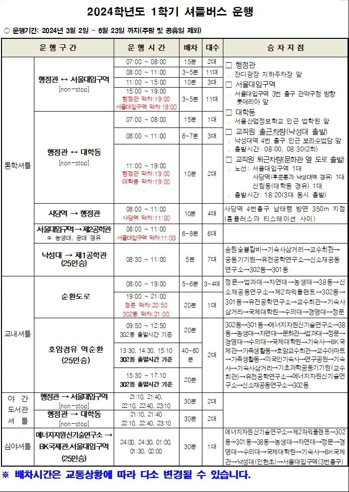 2024학년도 1학기 셔틀버스 운행을 아래와 같이 안내 하오니 셔틀버스 이용에 참고 하시기 바랍니다.