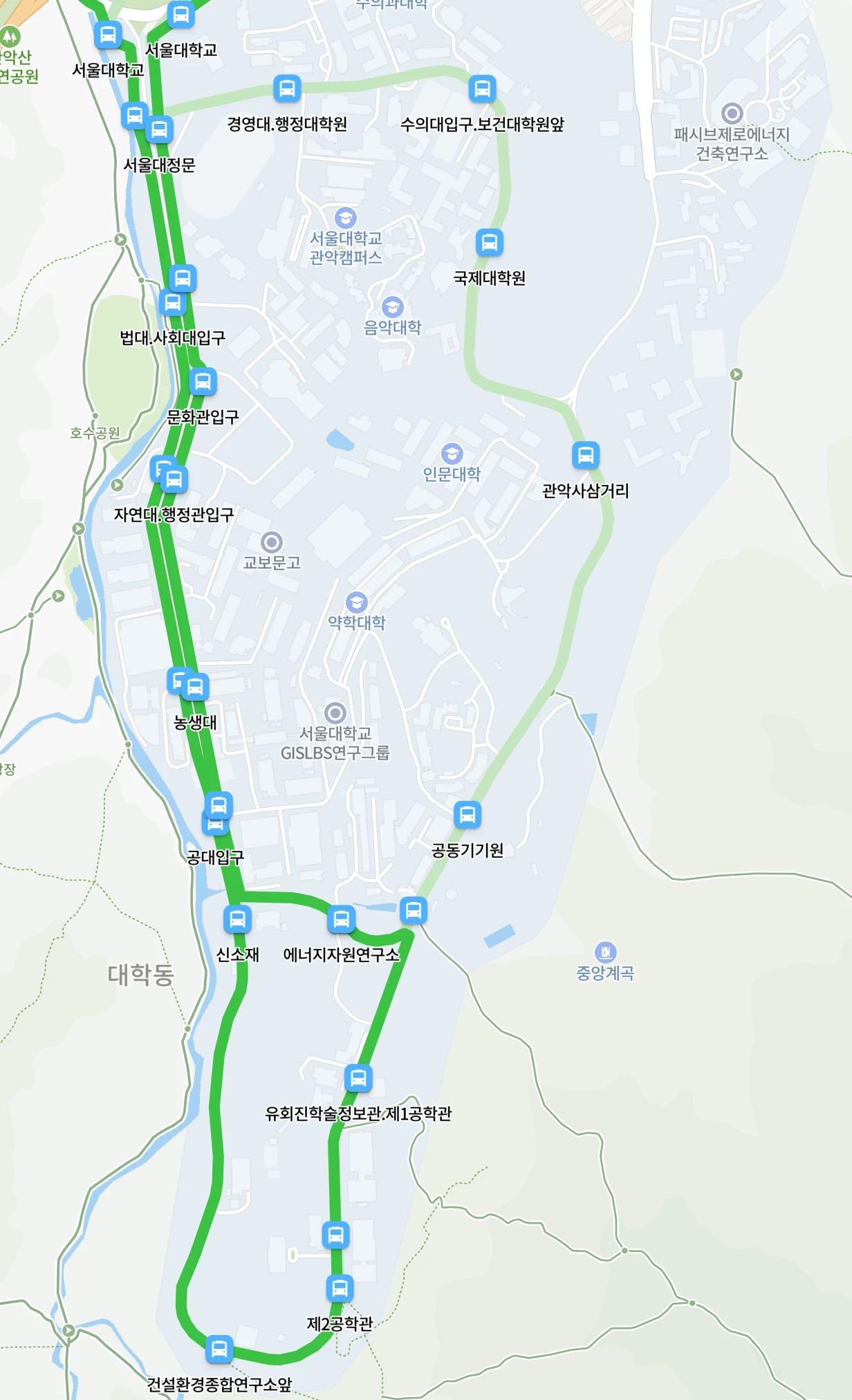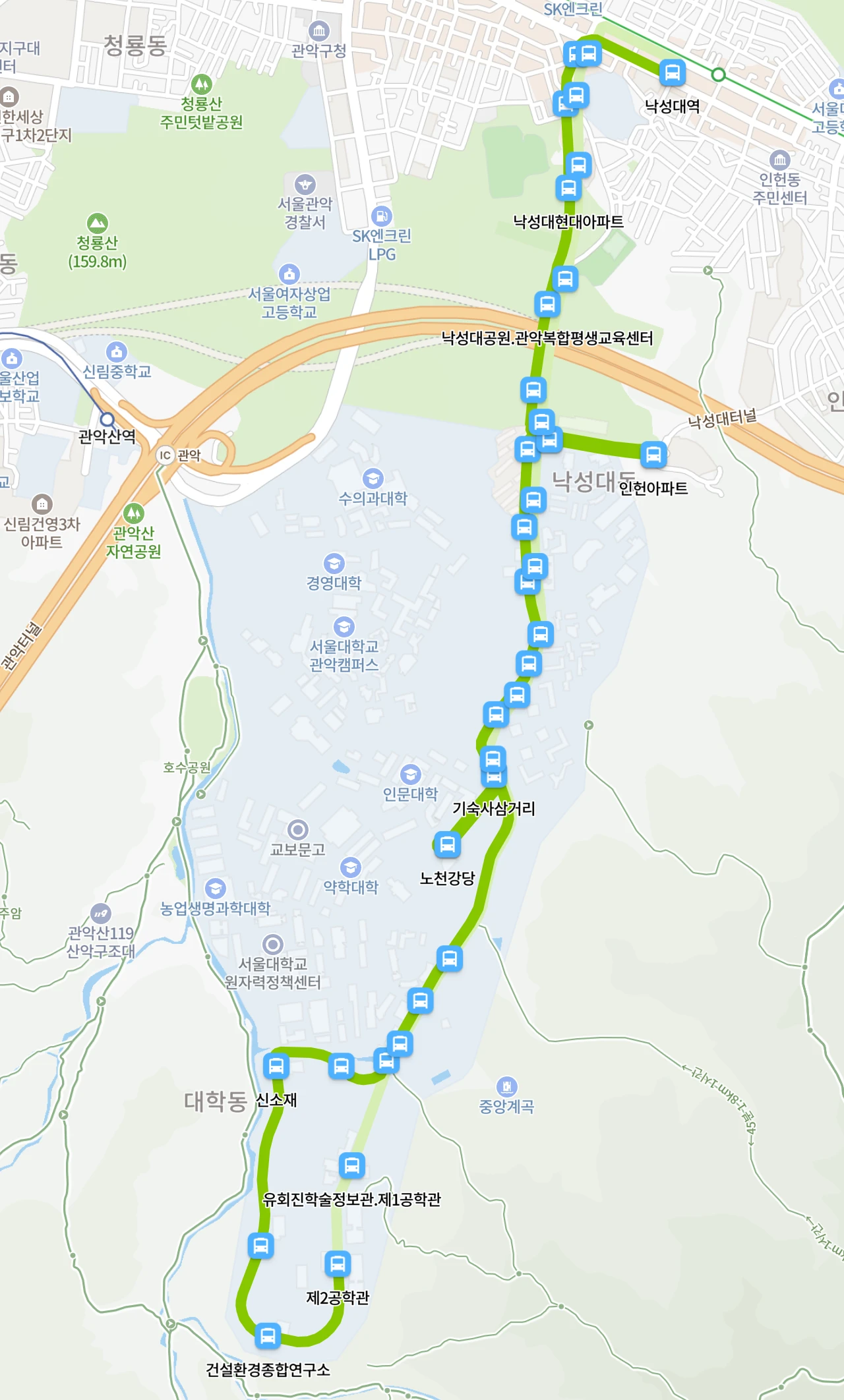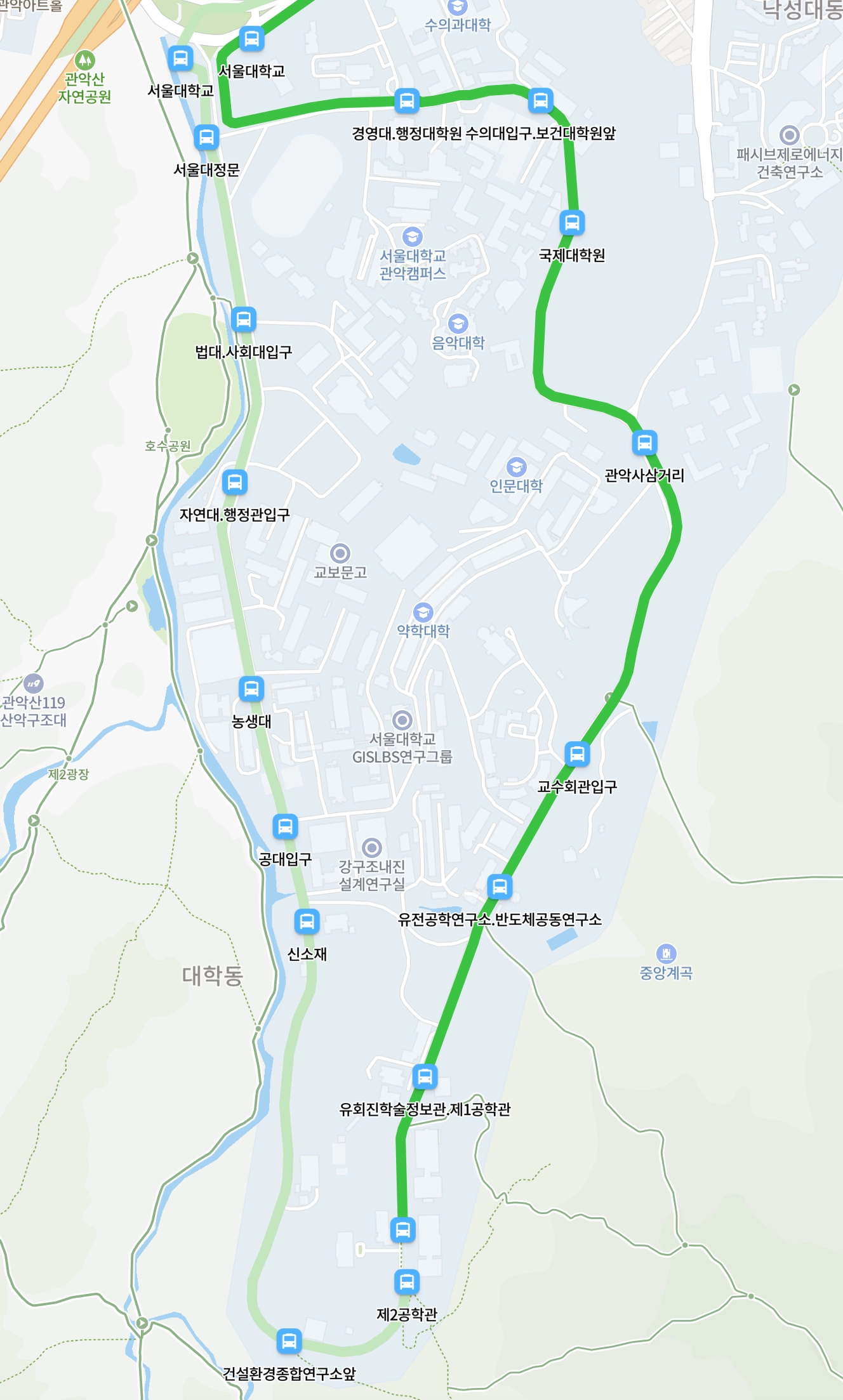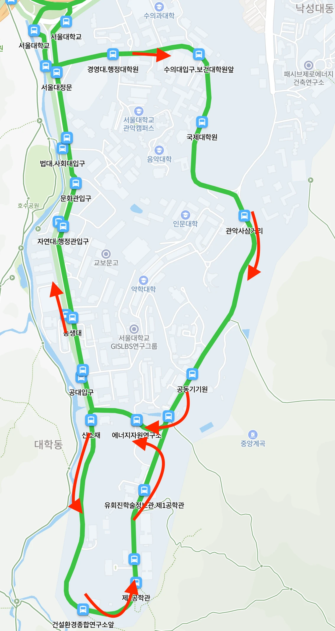 낙성대역에서 출발하여, 서울대 후문쪽으로 들어가 기숙사를 거쳐, 윗공대까지 올라갔다 내려온다