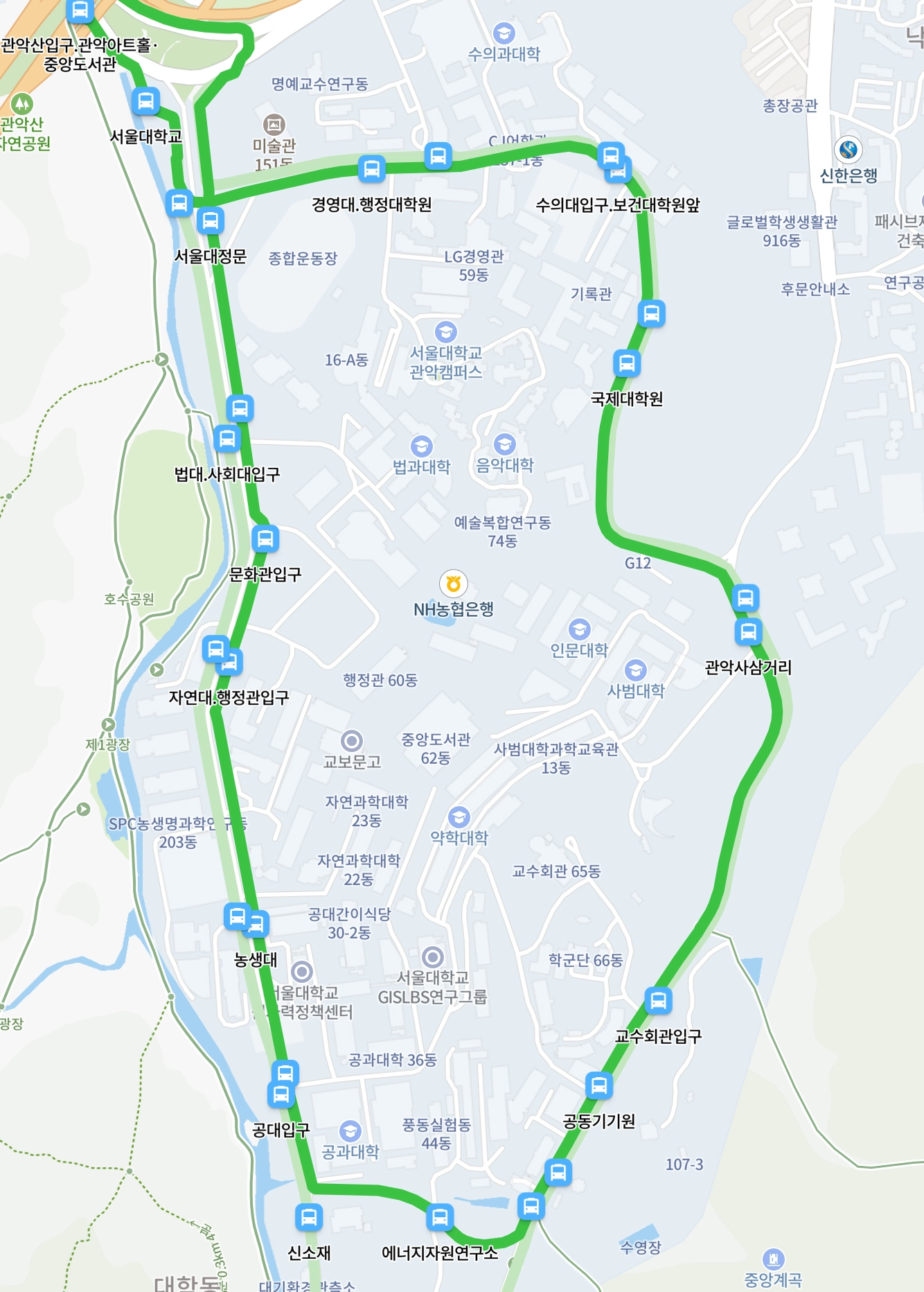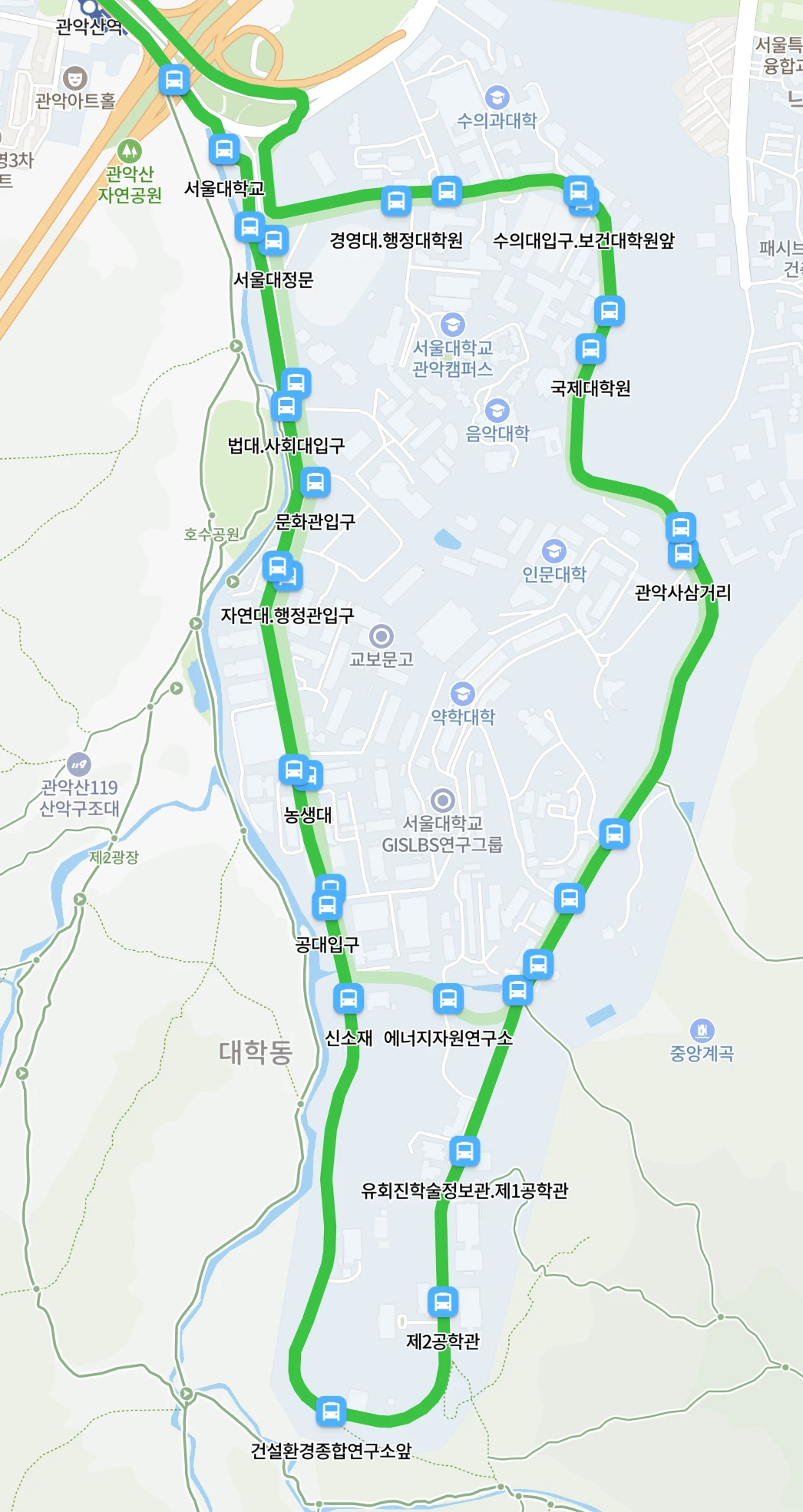 5516 (행정관 방향 - 정문에서 직진한 후 윗공대 올라가기 전에 좌회전하여 캠퍼스 반절을 돌고 온다)