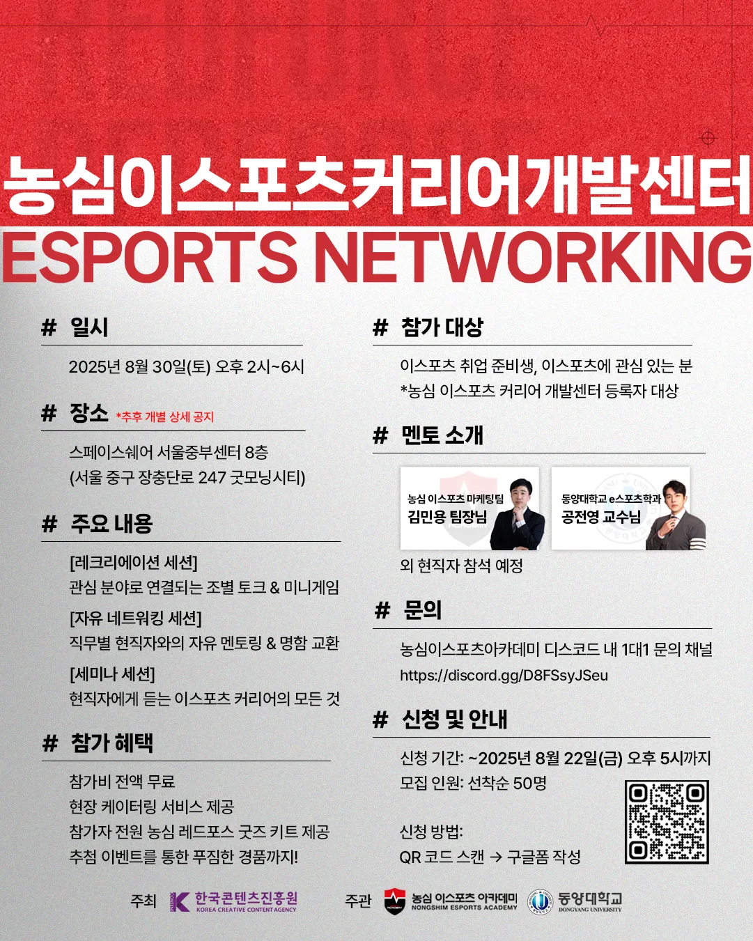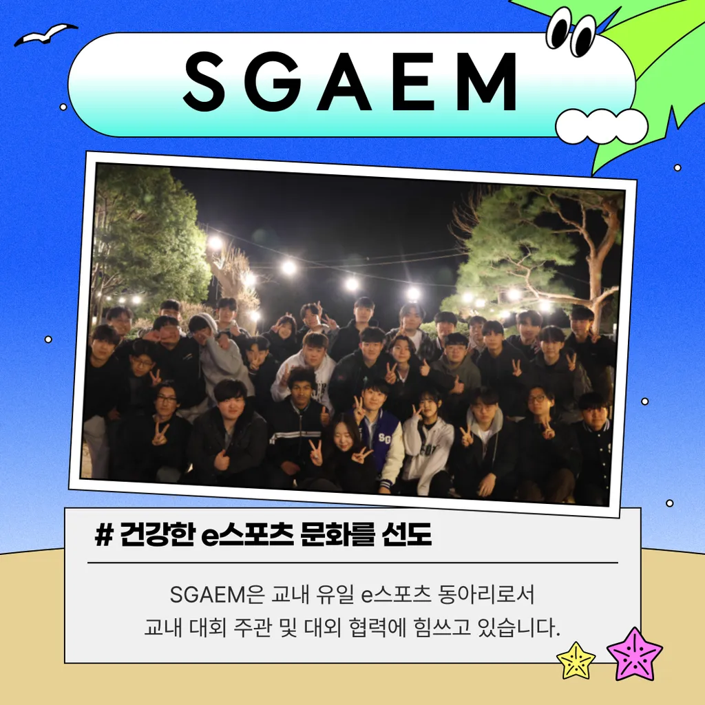 안녕하세요! 서강대학교 e스포츠 중앙동아리 ‘SGAEM’입니다! 신학기를 맞이하여 SGAEM에서 26번째 신입부원 모집을 합니다! [SGAEM은 무슨 동아리인가요?] SGAEM은 '서강대학교 e스포츠협회'(SoGang Association of E-sports Management)의 약자이며, 2014년 창설되어 교내 e스포츠 대회 주관, 대회 관련 이벤트 및 대외 협력, 동아리 부원들 간 친목활동의 삼박자를 지닌 동아리입니다. [SGAEM에서 진행하는 활동은 어떤 것들이 있을까요?] 스겜이 자체적으로 구축한 시스템을 통한 교내 e스포츠 대회 주최 및 진행 e스포츠 연관 컨텐츠 제작 및 송출 대외 e스포츠 관련 단체(농심 레드포스, 크래프톤 등)와 교류 및 협업 부원들과 함께하는 여러 친목활동 (LCK 관람과 같은 오프라인 활동, MT 등) [지원 기간] 지원서류 접수 : 2025.08.16(토) ~ 2025.08.23(토) 면접 대상자 안내 : 2025.08.24(일) 면접 일정 : 2025.08.25(월) ~ 2025.08.29(금) 최종 합격자 발표 : 2025.08.30(토) [지원 방법] 지원서(구글폼) : https://docs.google.com/forms/d/e/1FAIpQLSd9TNjFO5KSOEU7qoOIkn47Mbv23zxhwgclxrJ0SKtu0QfiYw/viewform?usp=header 위 링크의 지원서를 작성하면 됩니다! SGAEM에 대한 더 많은 내용은 스겜 유튜브, 노션 방문 또는 카드뉴스등을 확인함으로써 알아갈 수 있습니다! 면접은 지원 양식 기준 합격자 학우분들에 한하여 개인 문자 발송 예정입니다. SGAEM 링크트리 주소: https://linktr.ee/sgaem SGAEM 홍보 영상: https://youtu.be/tfPV8mz5IA0?si=rB3lQeLpcNHPhO8n Instagram: https://instagram.com/sogang_sgaem SGAEM Slashpage 사이트: https://slashpage.com/sogangsgaem/dk58wg2e616w1mnqevxz