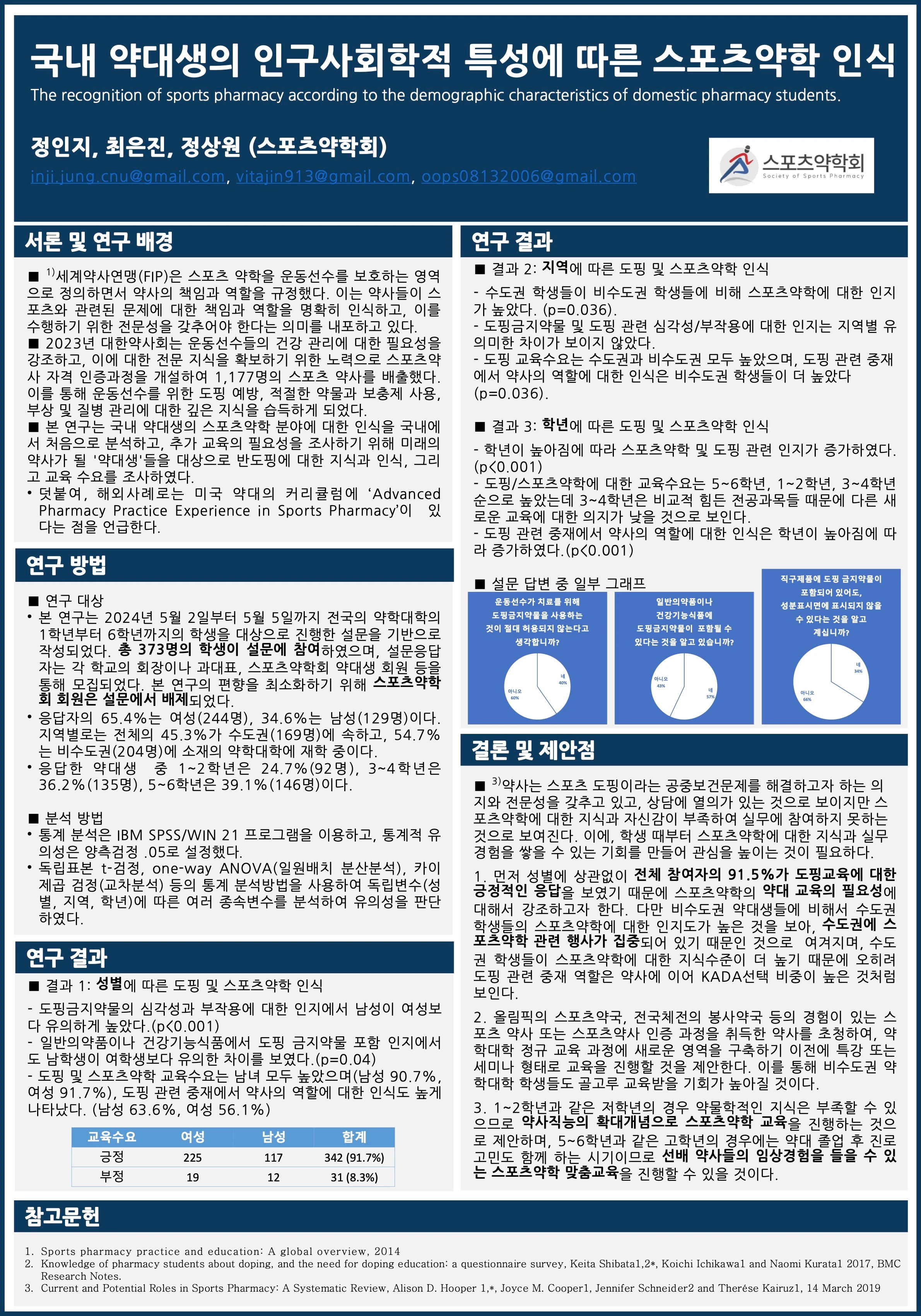 정상원, 강희철, 강태진 and 김희진. (2024). 국내 약국 약사의 반도핑 교육 및 상담 경험에 따른 지식과 태도. 한국사회약학회지, 12(2), 99-106. 초록 BACKGOUND The role of pharmacists in anti-doping education and in preventing doping is increasing, especially with a rise in recreational sports participation. However, there is a lack of research on how pharmacists in Korea handle doping-related counseling. METHODS An online survey with a structured questionnaire was performed from 169 pharmacists regarding their anti-doping knowledge, experience, and attitudes. Data was analyzed through crosstabulation and logistic regression. RESULTS Pharmacists who underwent anti-doping education or counseled athletes had higher levels of anti-doping knowledge. Most pharmacists had negative attitudes towards doping and felt they lacked sufficient knowledge to counsel athletes. Only a small percentage had experience working as sports pharmacists at major competitions. CONCLUSION Pharmacists with more anti-doping education or experience had better knowledge, but overall, most felt unprepared to advise athletes. More research and educational programs are needed to strengthen their role in anti-doping efforts. anti-doping, pharmacist, experiences, knowledge, attitudes, sports pharmacist