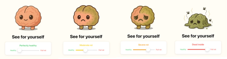 그가 만든 앱, 브레인롯(brainrot)은 스크롤하는 시간이 길어질수록 뇌가 '썩어가는' 모습을 보여주는 스크린 타임 모바일 앱입니다.