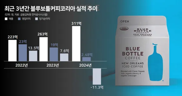 하지만 한국에 진출한 지 7년째인 현재 블루보틀은 자본잠식을 코 앞에 둔 상태다. 실제로 금융감독원 전자공시시스템에 따르면 블루보틀커피코리아는 지난해 매출액으로 311억9300만원을 기록했다. 전년도인 2023년 264억원이었던 것과 비교하면 17% 증가한 수치다.
