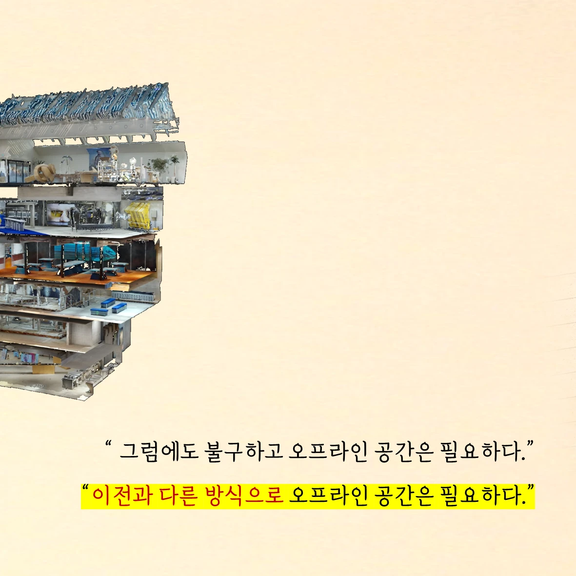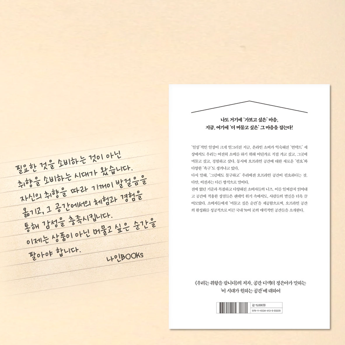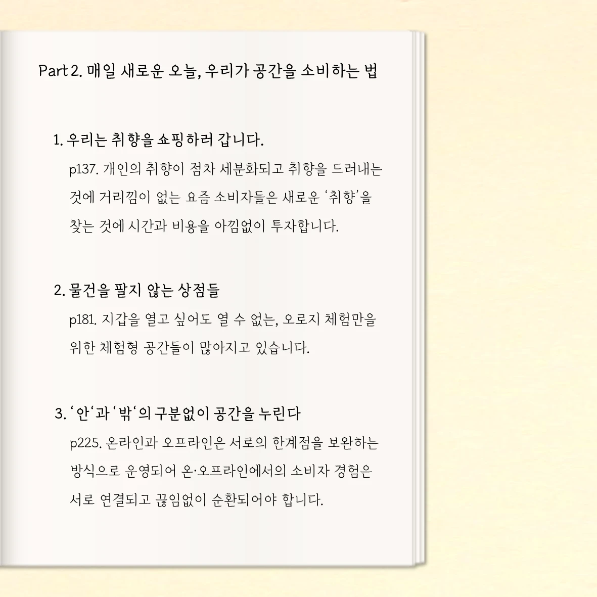 평소 공간 인테리어에 관심이 많았다. 직장을 다니면서 어쩌다 보니 부업으로 공간대여(파티룸) 사업을 시작하게 되었고, 나름 잘 꾸며 놓은 공간이 입소문을 타 꽤 괜찮은 부수입을 얻게 되었다. 그러던 중 갑자기 찾아온 코로나 시대. 이 코로나로 인해 디지털 전환과 언택트 소비가 급속도로 전개되면서 수많은 오프라인 공간들이 죽어갔다. 내가 운영하던 공간들도 마찬가지였다. 사람들의 발길이 줄어든 오프라인 공간을 다시 살리기 위해서는 기존과는 다른 무언가가 필요했다. 그 무언가를 찾기 위해 많은 시행착오를 겪어가고 있던 중 이 책을 발견했다.