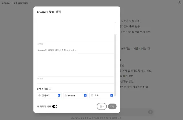 챗지피티 이용자는 우측상단에 위치한 계정 메뉴에 들어가면 ‘Chat GPT 맞춤설정’을 통해 맞춤형 지침을 입력할 수 있다. 상단에는 1500자 분량으로 미리 알아두어야 할 사항에 대해 적을 수 있고, 하단에는 응답하는 방식을 구체적으로 입력할 수 있다.