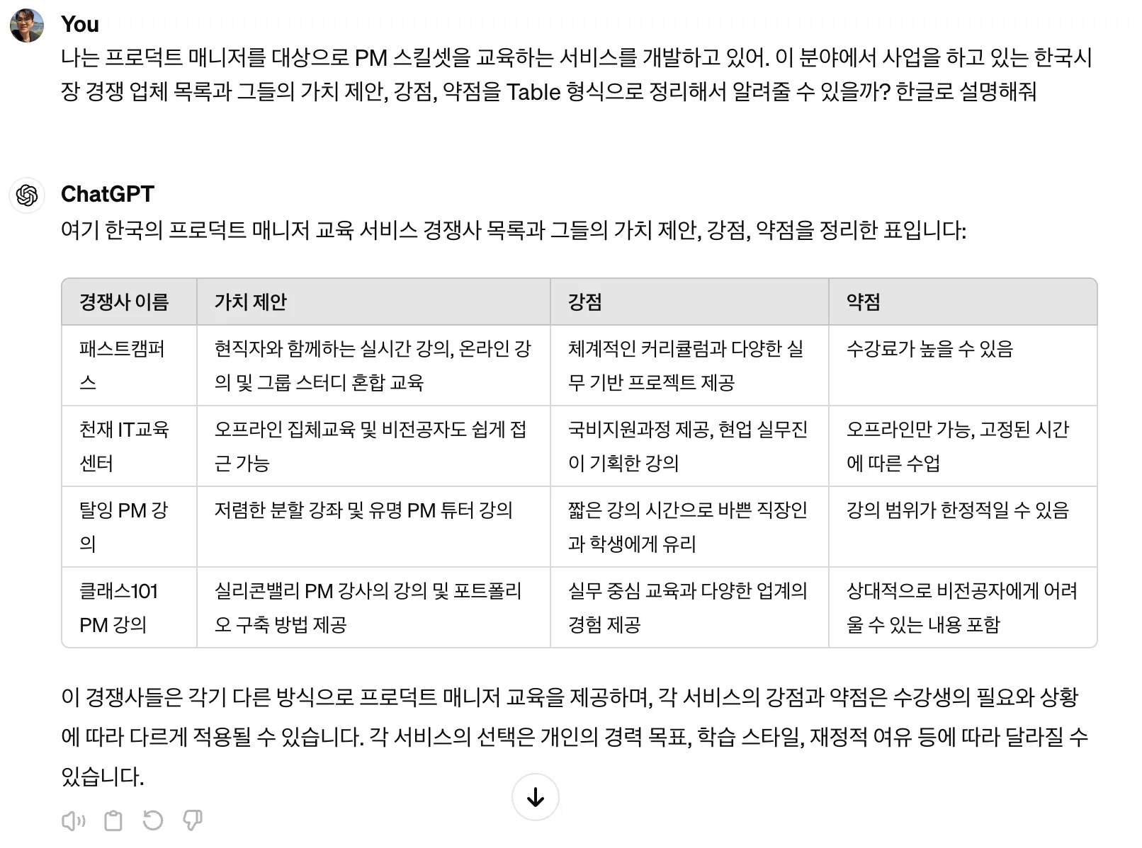 ChatGPT 4.0을 활용하여 경쟁사의 가치제안(value proposition), 마켓 사이즈 등을 리서치하기 위한 프롬프트를 소개드리겠습니다. 1. 경쟁사 가치제안, 강점, 약점을 간단히 조사하기 프롬프트1. 나는 {프로덕트 매니저를 대상으로 PM 스킬셋을 교육하는 서비스}를 개발하고 있어. 이 분야에서 사업을 하고 있는 {한국시장} 경쟁 업체 목록과 그들의 가치 제안, 강점, 약점을 Table 형식으로 정리해서 알려줄 수 있을까? 한글로 설명해줘