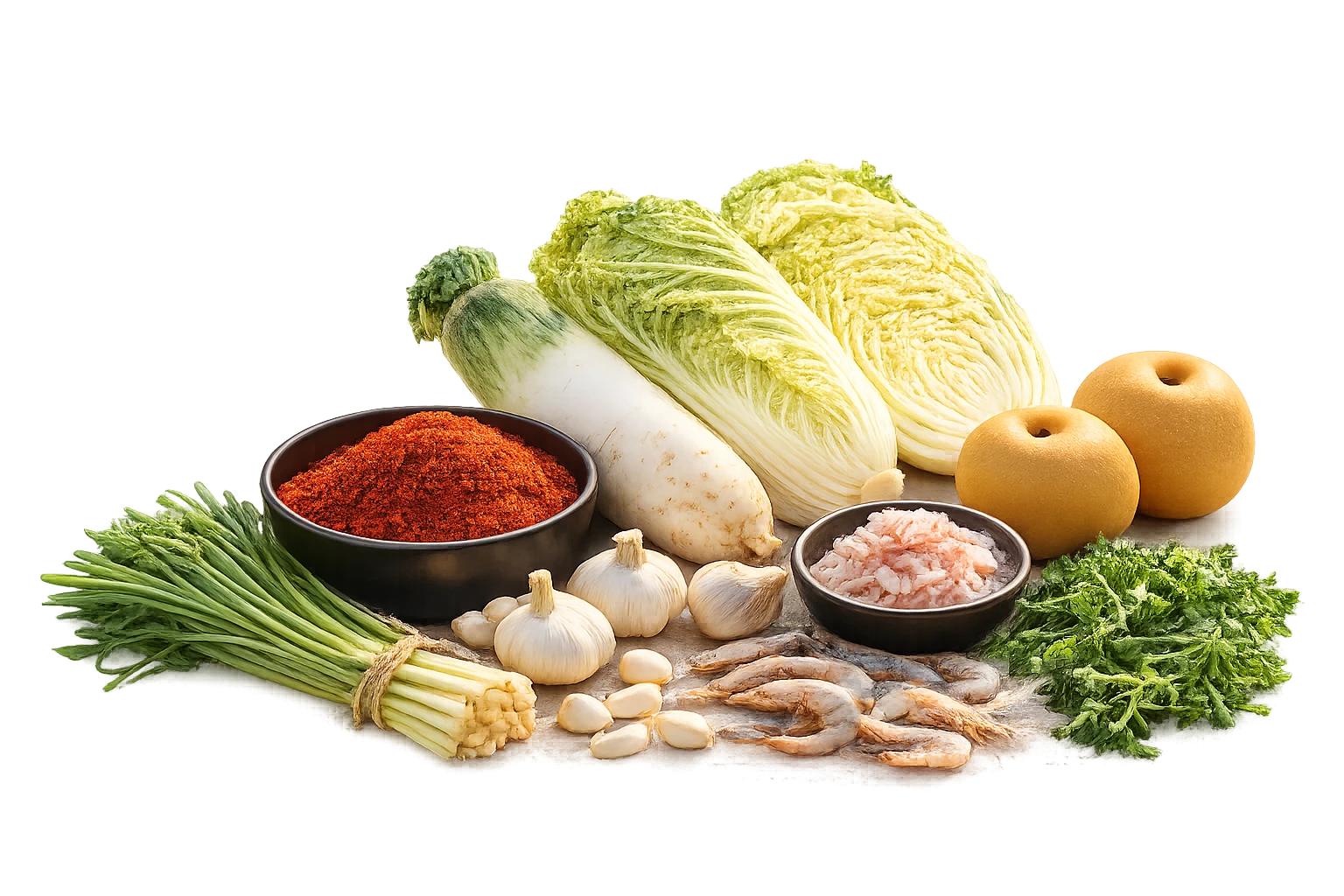 고춧가루, 마늘, 파, 배추, 배, 새우젓갈, 무, 미나리 생물 그대로를 자연스러운 배치와 나워져 있는 구도로 보여줌.(제시한 재료의 배치만 첨부한 파일 참고 그 외는 사용 하지 않음)