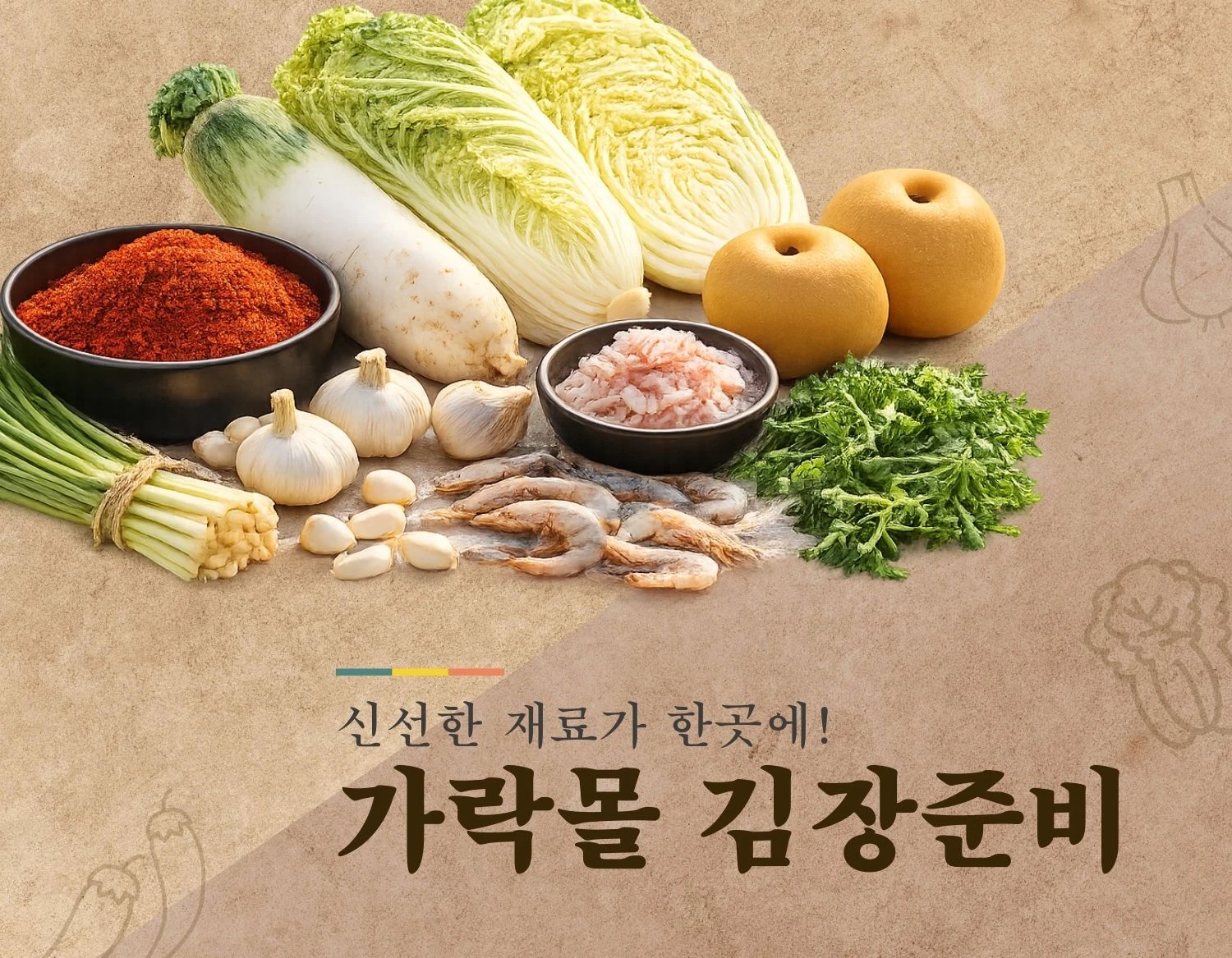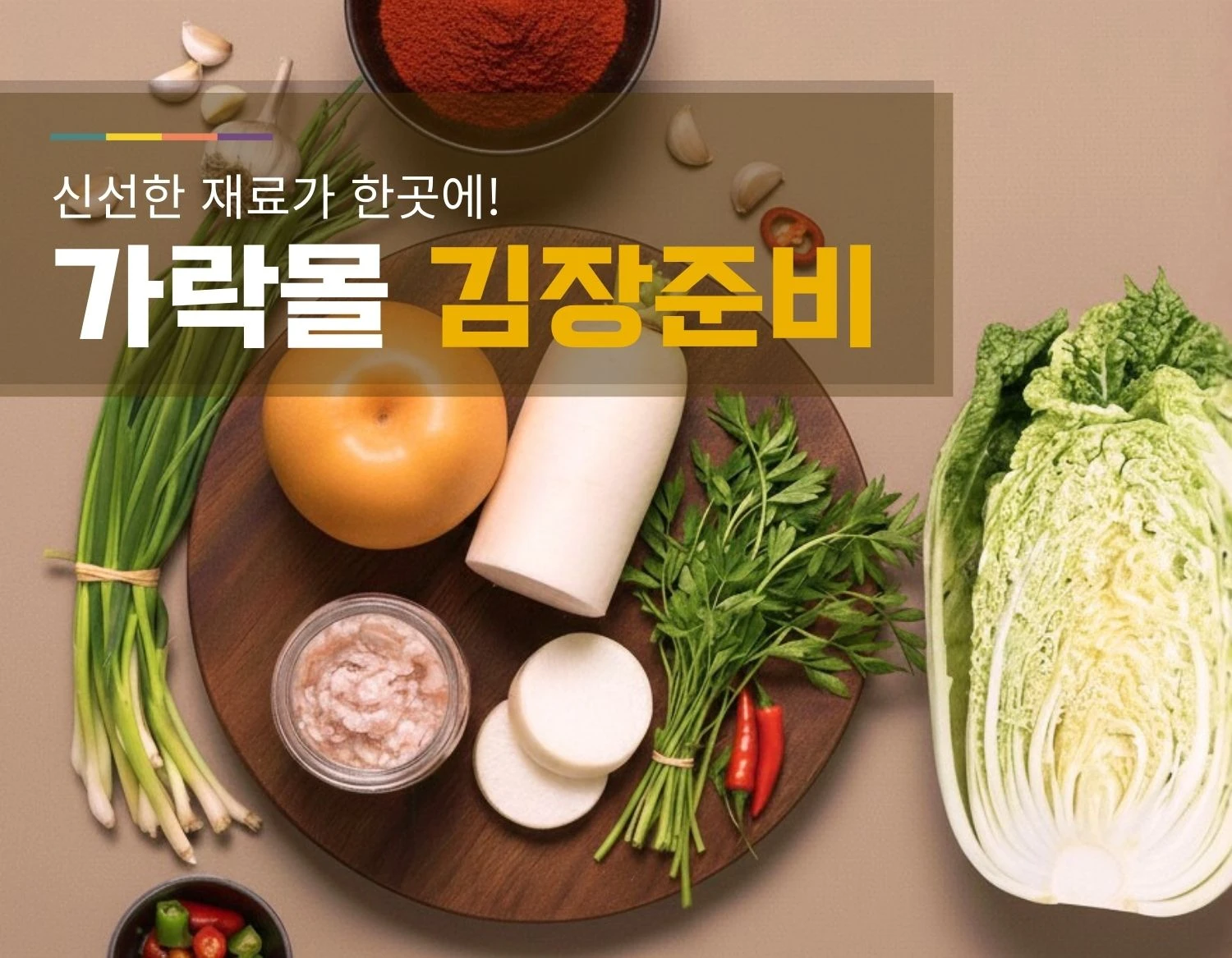 이미지 주제 : 김장철을 맞아 짐치 재료를 전통시장 한 곳에서 구매 가능하다는 내용의 이미지. (김치 재료들을 나열 해 보여줌)