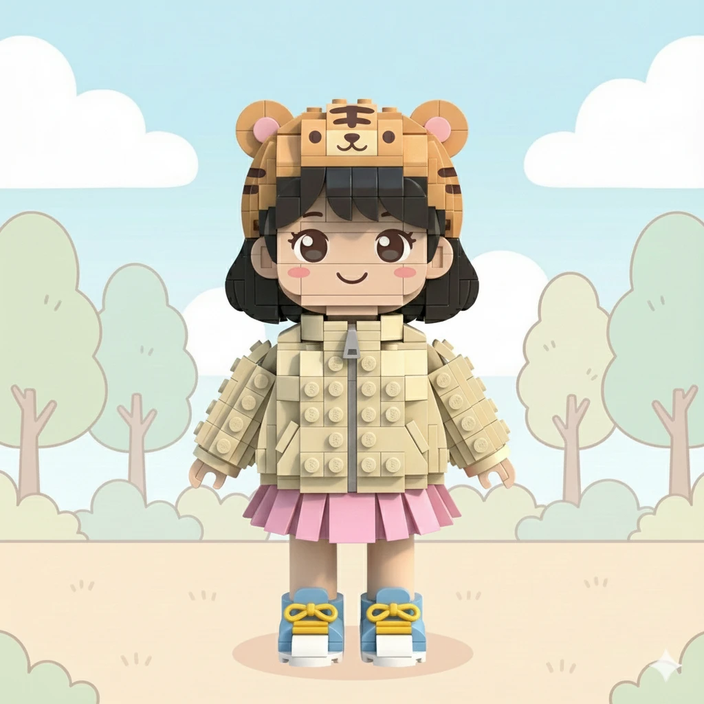 중앙에 서 있는 캐릭터를 3D 입체 레고 스타일(색상, 블럭크기 자연스럽게)로 변경해줘. 배경 등 다른 것들은 변경없어.