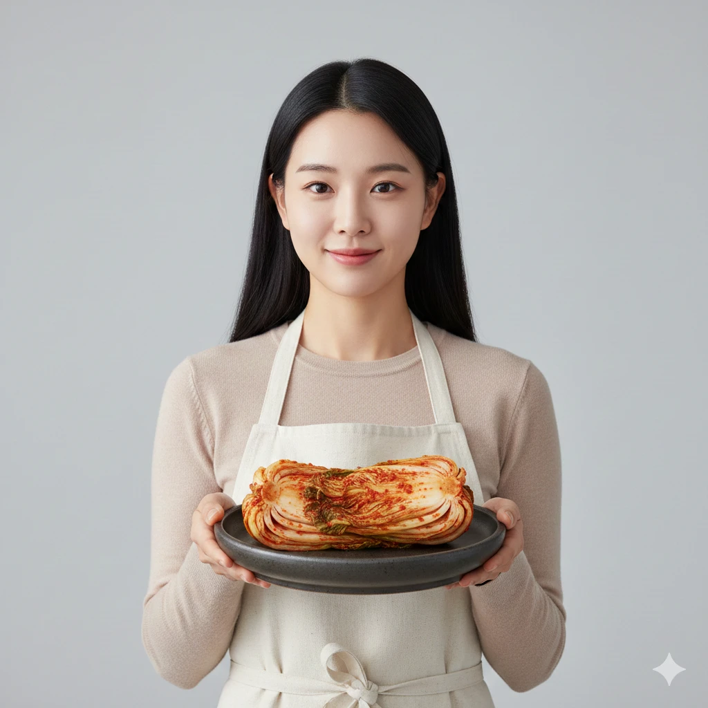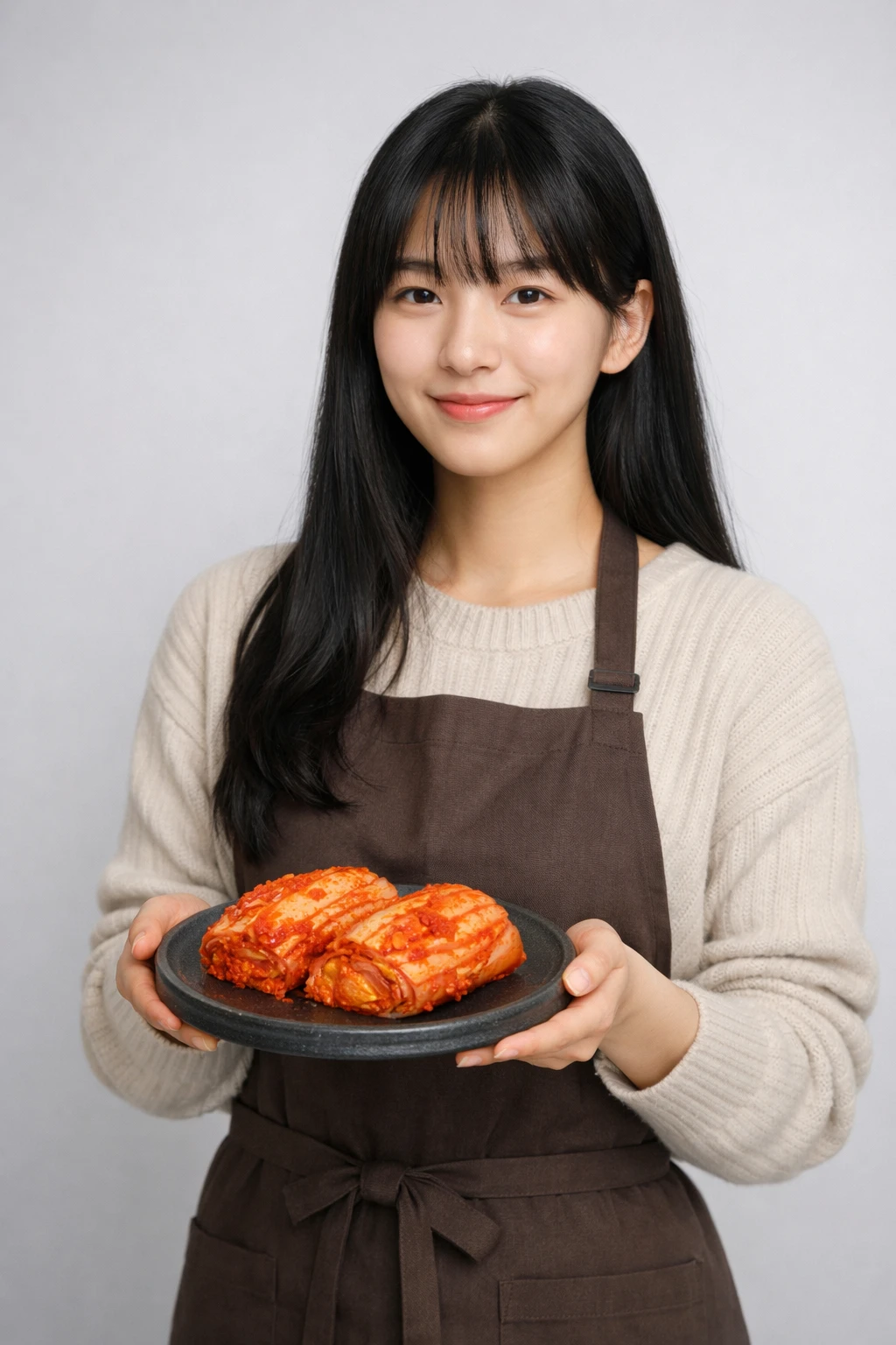 손에는 검회색 계열의 장독대 뚜겅과 비슷한 접시에 김치(먹음직스러운 색, 반포기로 잘라진것 2개)가 놓여져 있는걸 들고 있어.