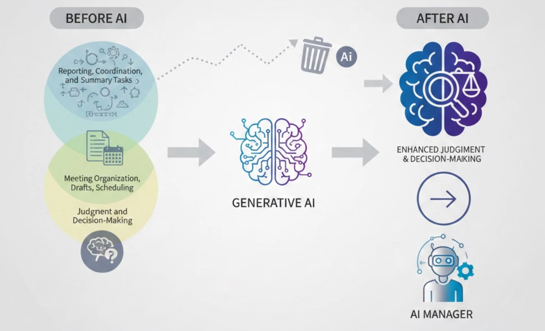 생성AI가 조직 안으로 빠르게 들어오면서, 가장 먼저 흔들리기 시작한 포지션이 있습니다. 바로 관리자, 매니저 역할인데요. 회의 정리, 보고서 작성, 진척 관리처럼 그동안 관리자의 핵심 업무로 여겨졌던 일들을 AI가 대신하기 시작했기 때문입니다.